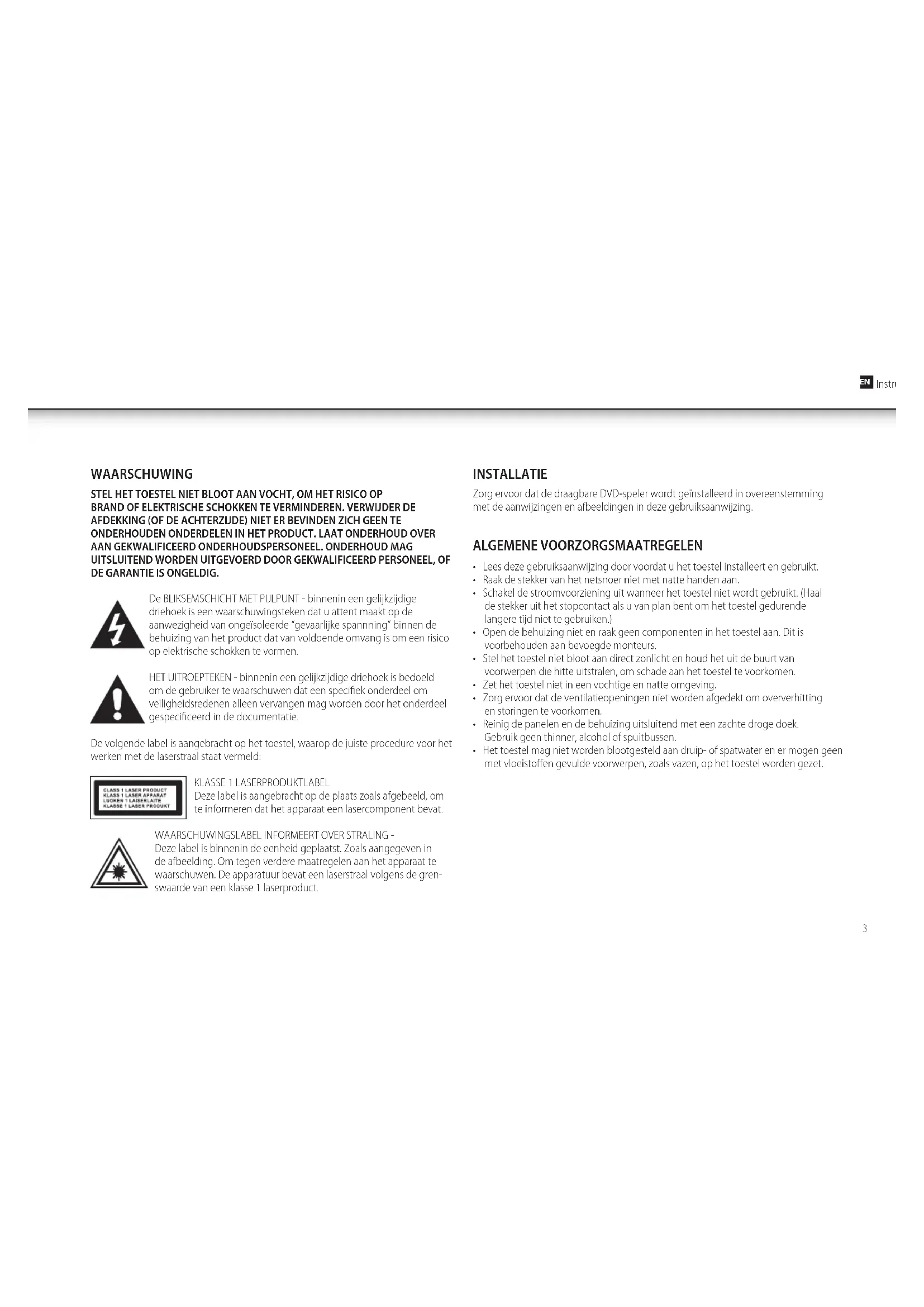 Zorg ervoor dat de draagbare DVD-speler worden geinstalleerd in overeenstemming met de aanwijzingen en afbeeldingen in deze gebruksaanwijzing.