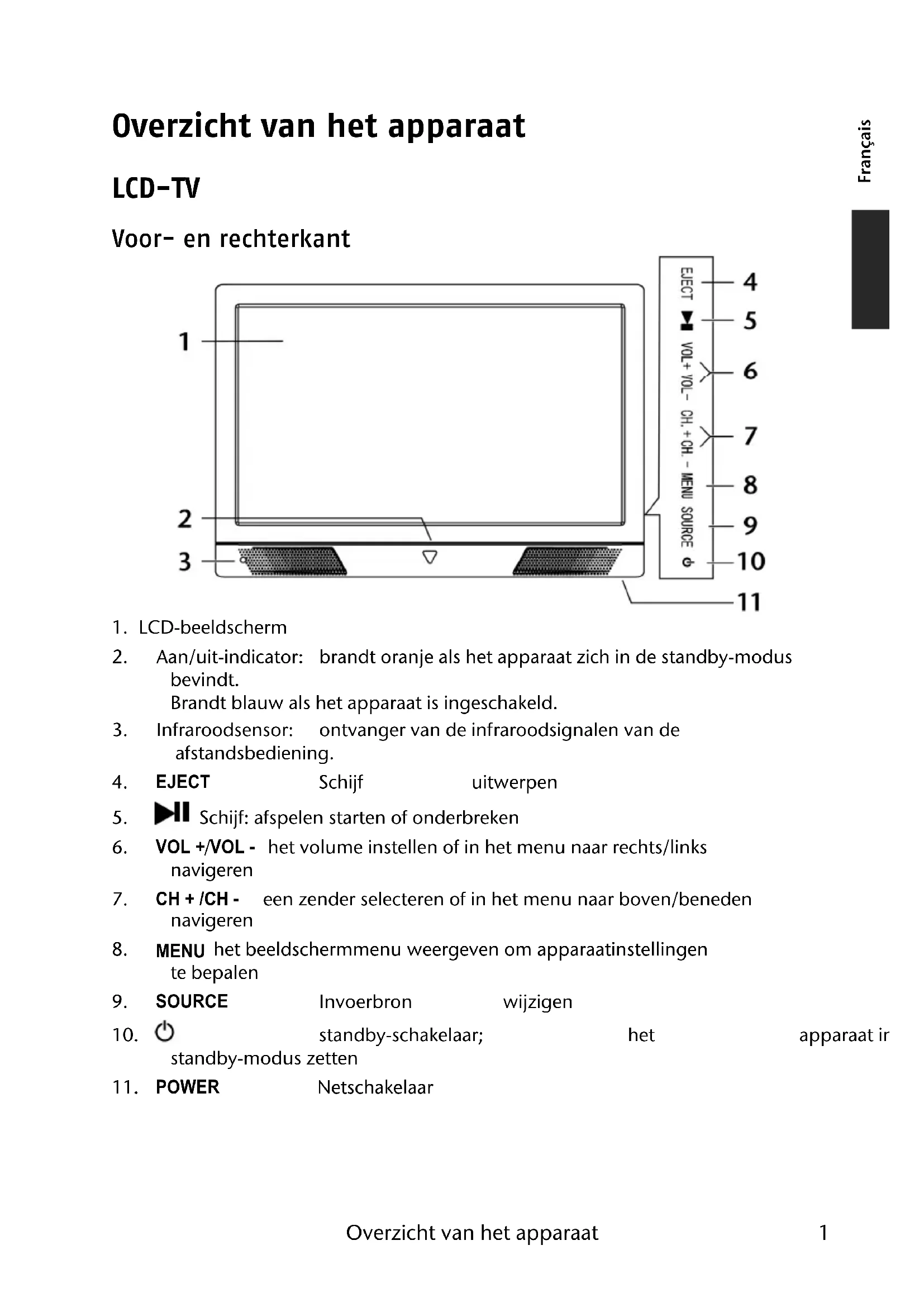 Français Nederlands Deutsch Overzicht van het apparaat LCD-TV Voor- en rechterkant
