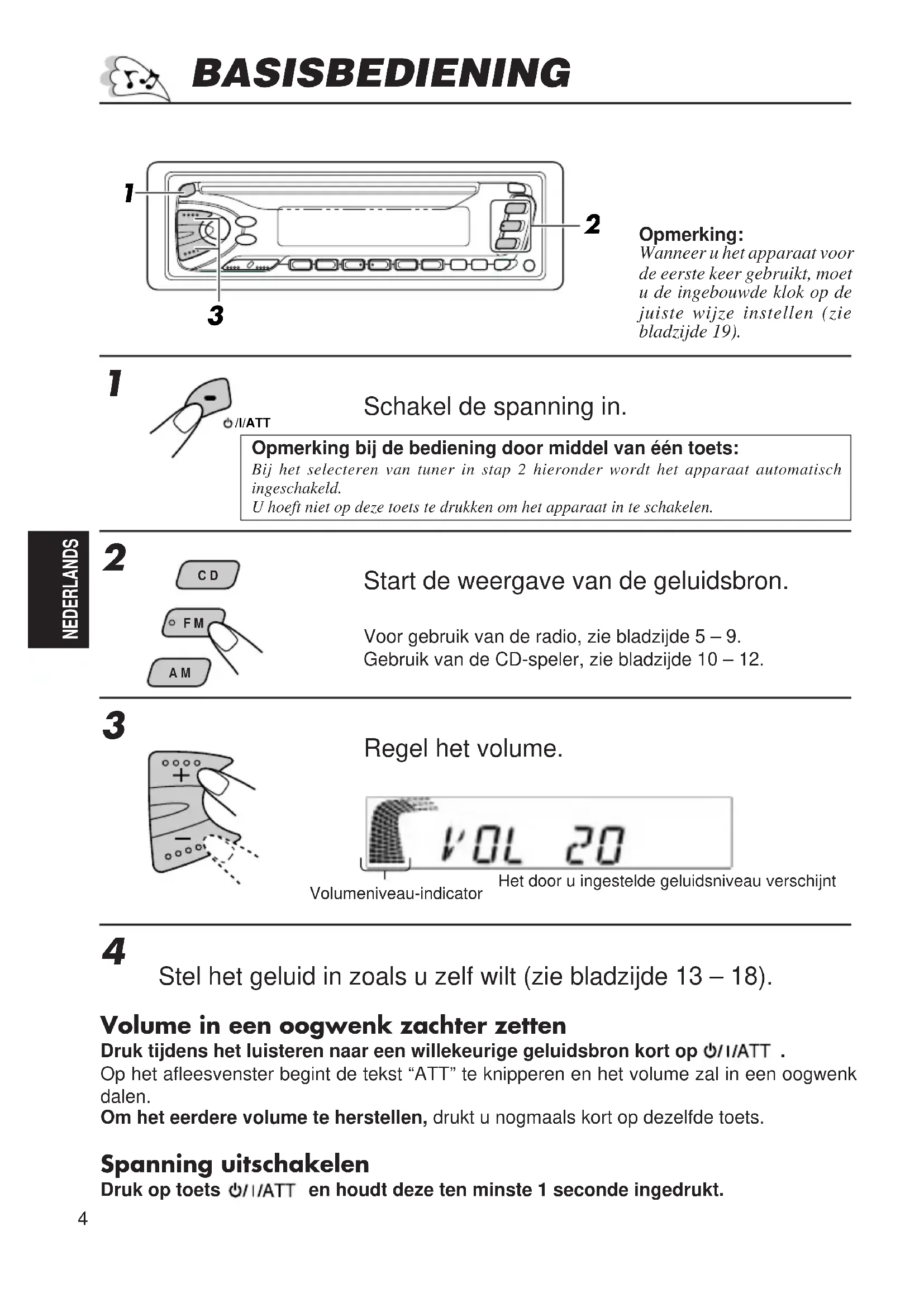 Stel het geluid in zoals u zelf wilt (zie bladzijde 13 – 18). Volume in een oogwenk zachter zetten Druk tijdens het luisteren naar een willekeurige geluidsbron kort op .Op het afleesvenster begint de tekst “ATT” te knipperen en het volume zal in een oogwenkdalen.Om het eerdere volume te herstellen, drukt u nogmaals kort op dezelfde toets. Spanning uitschakelen Druk op toets en houdt deze ten minste 1 seconde ingedrukt. BASISBEDIENING Opmerking:Wanneer u het apparaat voorde eerste keer gebruikt, moetu de ingebouwde klok op dejuiste wijze instellen (ziebladzijde 19).Opmerking bij de bediening door middel van één toets:Bij het selecteren van tuner in stap 2 hieronder wordt het apparaat automatischingeschakeld.U hoeft niet op deze toets te drukken om het apparaat in te schakelen.