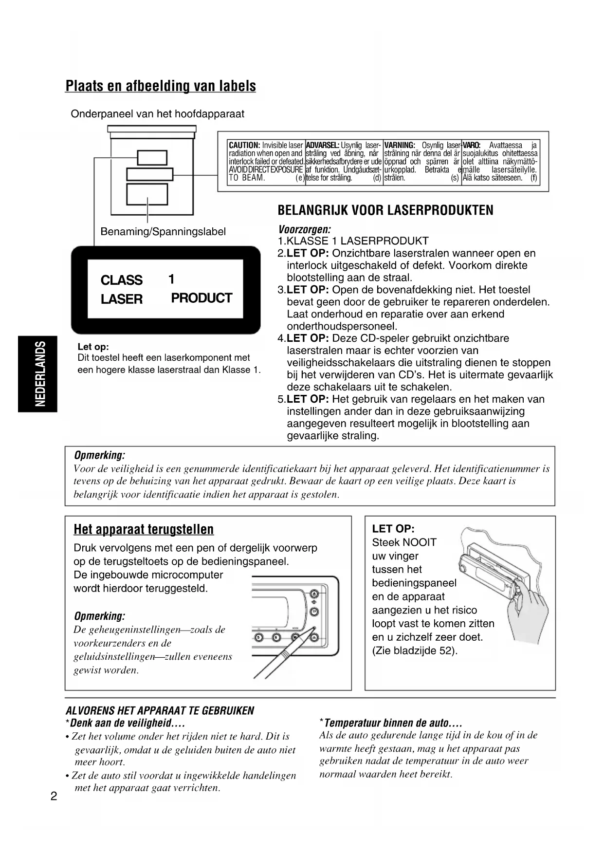 PRODUCT CAUTION: Invisible laser radiation when open and interlock failed or defeated. AVOID DIRECT EXPOSURE TO BEAM. (e)ADVARSEL: Usynlig laser-stråling ved åbning, når sikkerhedsafbrydere er ude af funktion. Undgåudsæt-telse for stråling. (d)VARNING: Osynlig laser-strålning när denna del är öppnad och spärren ärurkopplad. Betrakta ejstrålen. (s)VARO: Avattaessa jasuojalukitus ohitettaessaolet alttiina näkymättö-mälle lasersäteilylle.Älä katso säteeseen. (f) NL02-06SH9101[E_EX]f.p65 2/26/2003, 10:01 AM23 NEDERLANDS INHOUDSOPGAVE Hartelijk dank voor d e aanschaf van dit JVC-product! Wij verzoeken u de gebruiksaanwijzing goed door te lezen voordat u het apparaat gaat gebruiken. Zo krijgt u een volledig inzicht in de functies van het apparaat en kunt u de mogelijkheden optimaal benutten. Het apparaat terugstellen ............................. 2