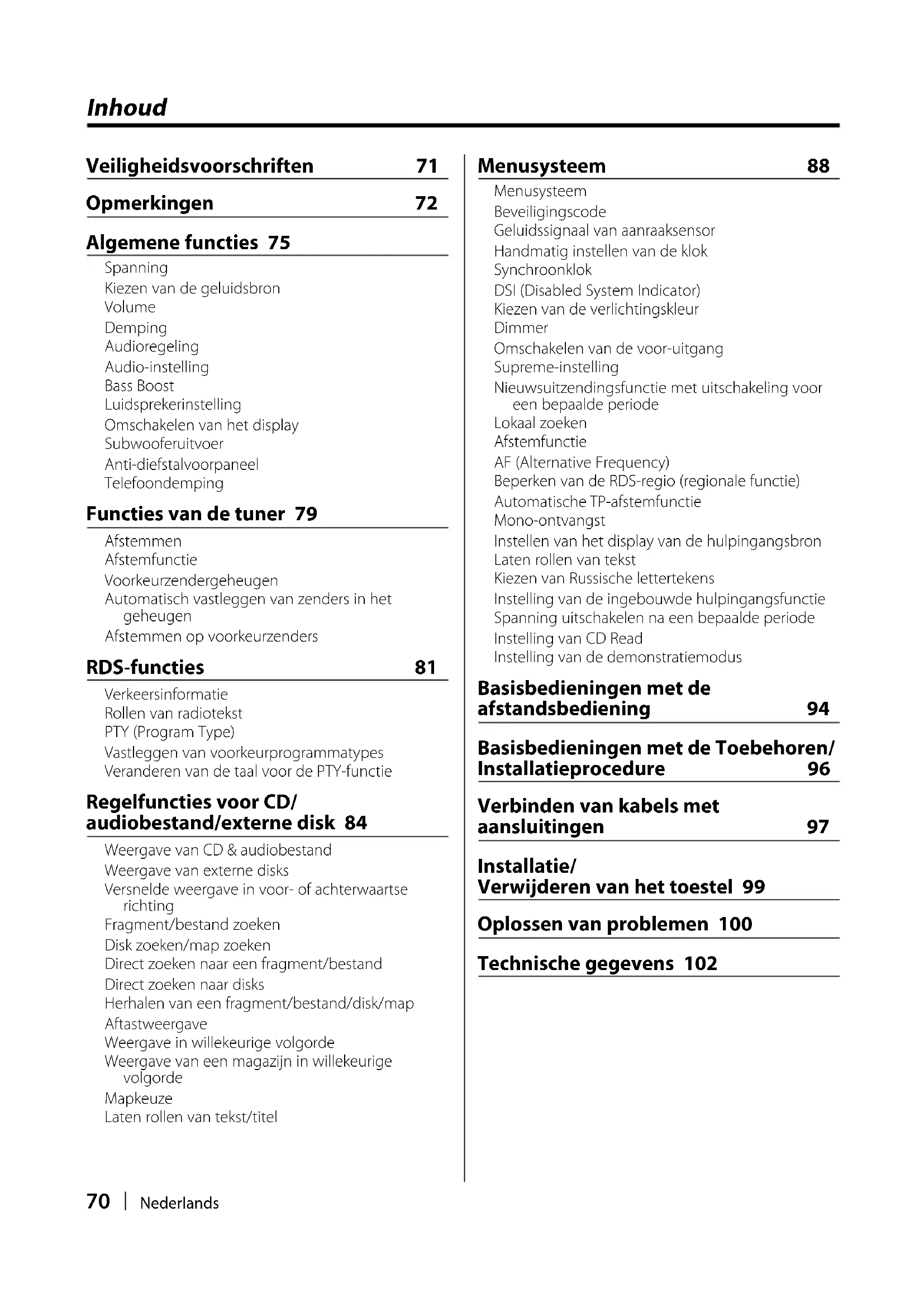 Nederlands Inhoud Veiligheidsvoorschriften 71 Opmerkingen 72 Algemene functies 75 Spanning Kiezen van de geluidsbron Volume Demping Audioregeling Audio-instelling Bass Boost Luidsprekerinstelling Omschakelen van het display Subwooferuitvoer Anti-diefstalvoorpaneel Telefoondemping Functies van de tuner 79 Afstemmen Afstemfunctie Voorkeurzendergeheugen Automatisch vastleggen van zenders in het geheugen Afstemmen op voorkeurzenders RDS-functies 81 Verkeersinformatie Rollen van radiotekst PTY (Program Type) Vastleggen van voorkeurprogrammatypes Veranderen van de taal voor de PTY-functie Regelfuncties voor CD/ audiobestand/externe disk 84 Weergave van CD & audiobestand Weergave van externe disks Versnelde weergave in voor- of achterwaartse richting Fragment/bestand zoeken Disk zoeken/map zoeken Direct zoeken naar een fragment/bestand Direct zoeken naar disks Herhalen van een fragment/bestand/disk/map Aftastweergave Weergave in willekeurige volgorde Weergave van een magazijn in willekeurige volgorde Mapkeuze Laten rollen van tekst/titel Menusysteem 88 Menusysteem Beveiligingscode Geluidssignaal van aanraaksensor Handmatig instellen van de klok Synchroonklok DSI (Disabled System Indicator) Kiezen van de verlichtingskleur Dimmer Omschakelen van de voor-uitgang Supreme-instelling Nieuwsuitzendingsfunctie met uitschakeling voor een bepaalde periode Lokaal zoeken Afstemfunctie AF (Alternative Frequency) Beperken van de RDS-regio (regionale functie) Automatische TP-afstemfunctie Mono-ontvangst Instellen van het display van de hulpingangsbron Laten rollen van tekst Kiezen van Russische lettertekens Instelling van de ingebouwde hulpingangsfunctie Spanning uitschakelen na een bepaalde periode Instelling van CD Read Instelling van de demonstratiemodus Basisbedieningen met de afstandsbediening 94 Basisbedieningen met de Toebehoren/ Installatieprocedure 96 Verbinden van kabels met aansluitingen 97 Installatie/ Verwijderen van het toestel 99 Oplossen van problemen 100 Technische gegevens 102 B64-3555-00Dutch.indd70B64-3555-00Dutch.indd70 06.10.267:16:15PM06.10.267:16:15PMNederlands