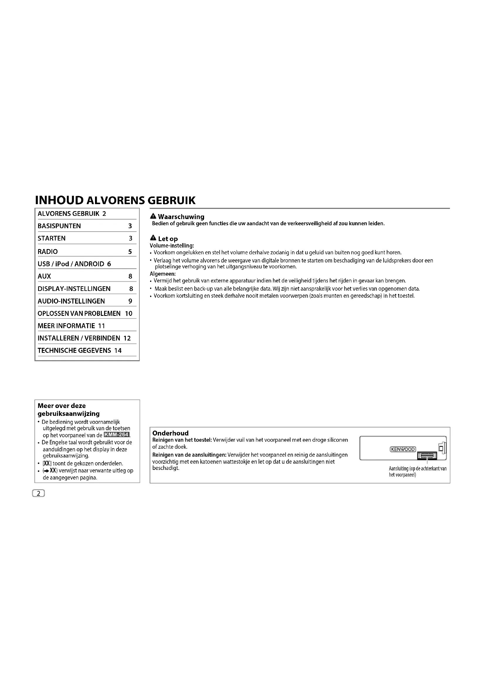 Voorkom kortsluiting en steek derhalve nooit metalen voorwerpen (zoals munten en gereedschap) in het toestel. ALVORENS GEBRUIK 2 BASISPUNTEN 3 STARTEN 3 RADIO 5 USB / iPod / ANDROID 6 AUX 8 DISPLAY-INSTELLINGEN 8 AUDIO-INSTELLINGEN 9