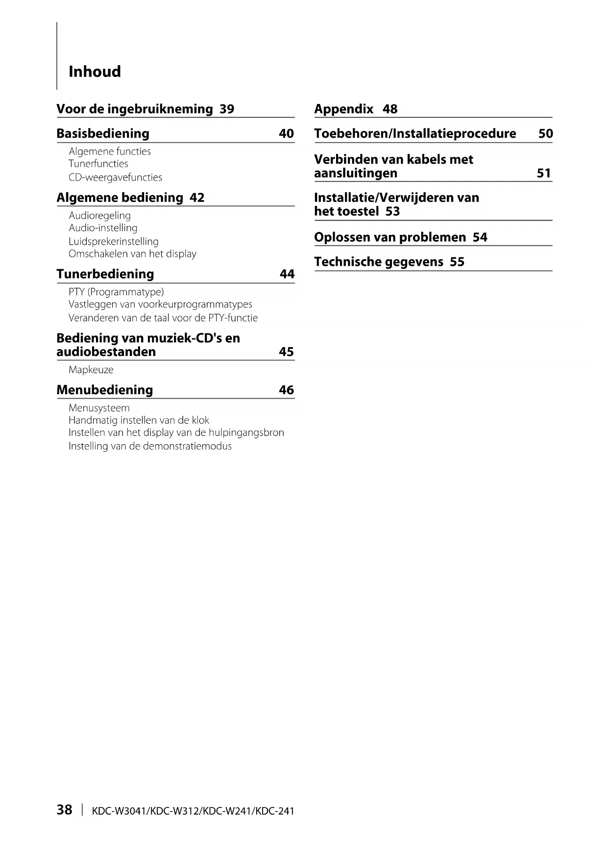 Inhoud Voor de ingebruikneming 39 Basisbediening 40 Algemene functies Tunerfuncties CD-weergavefuncties Algemene bediening 42 Audioregeling Audio-instelling Luidsprekerinstelling Omschakelen van het display Tunerbediening 44 PTY (Programmatype) Vastleggen van voorkeurprogrammatypes Veranderen van de taal voor de PTY-functie Bediening van muziek-CD's en audiobestanden 45 Mapkeuze Menubediening 46 Menusysteem Handmatig instellen van de klok Instellen van het display van de hulpingangsbron Instelling van de demonstratiemodus