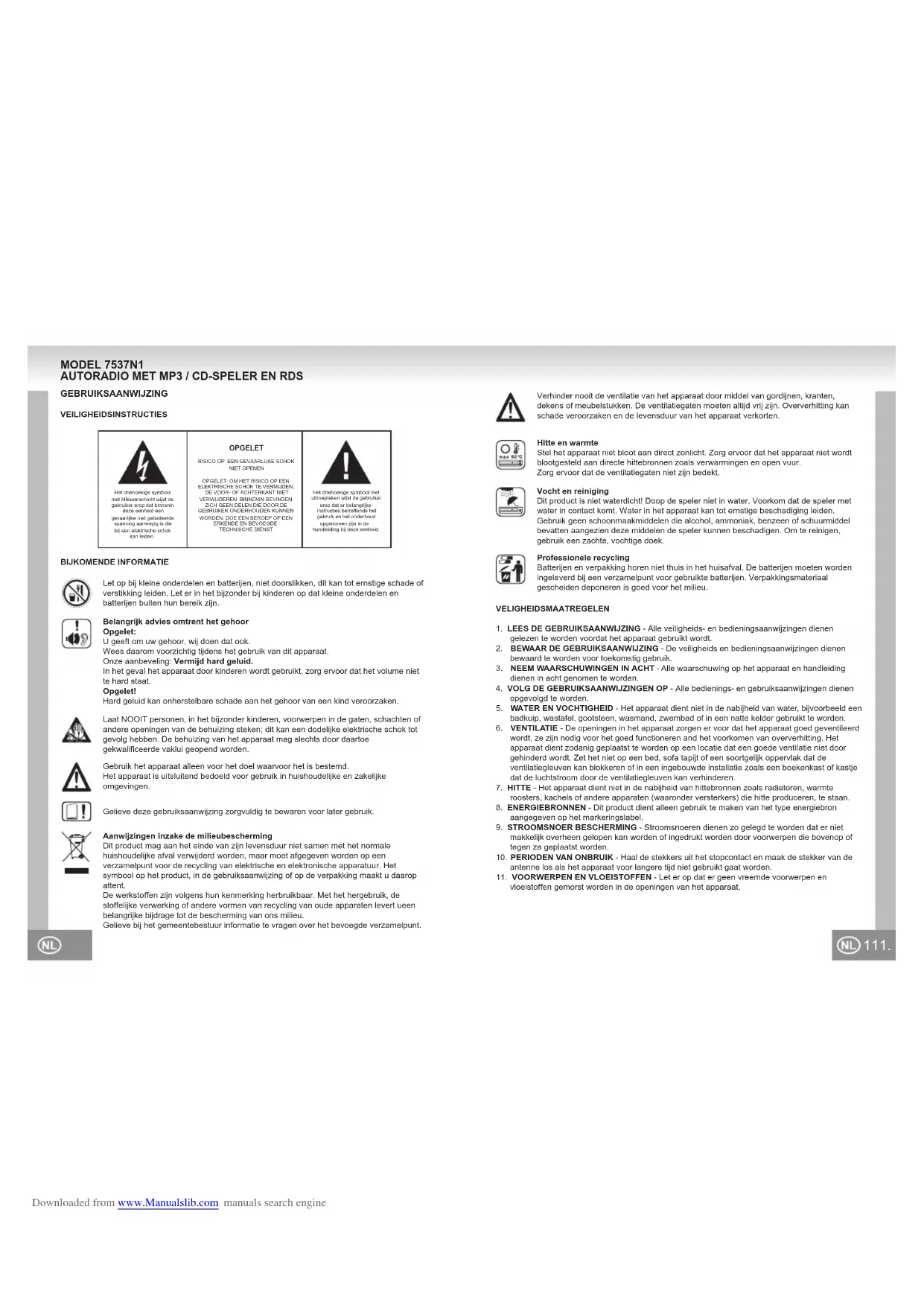 Zakres częstotliwości 522 kHz - 1620 kHz Skuteczność 40 dB Częstotliwość pośrednia 450 kHz ODTWARZACZ CD System standard Compact Disc Audio System Obsługiwane formaty płyt CD / CD-R / CD-RW / MP3 Format sygnału Częstotliwość próbkowania 44,1 kHz Charakterystyka częstotliwości 20-100 Hz ≤ 5 dB 10-20 kHz ≤ 5 dB Stosunek sygnału do szumów na CD 50 dB @ 1 kHz Kanały 2 (Stereo) Wymiary ok. 178 x 50 x 188 mm Waga ok. 1,6 kg DANE TECHNICZNE MOGĄ ULEC ZMIANIE BEZ UPRZEDNIEGO ZAWIADOMIENIA. Downloaded from www.Manualslib.com manuals search engine111. 110. Het driehoekige symbool met bliksemschicht wijst de gebruiker erop dat binnenin deze eenheid een gevaarlijke niet geïsoleerde spanning aanwezig is die tot een elektrische schok kan leiden.Het driehoekige symbool met uitroepteken wijst de gebruiker erop dat er belangrijke instructies betreffende het gebruik en het onderhoud opgenomen zijn in de handleiding bij deze eenheid.OPGELETRISICO OP EEN GEVAARLIJKE SCHOKNIET OPENEN OPGELET: OM HET RISICO OP EEN ELEKTRISCHE SCHOK TE VERMIJDEN, DE VOOR- OF ACHTERKANT NIET VERWIJDEREN. BINNENIN BEVINDEN ZICH GEEN DELEN DIE DOOR DE GEBRUIKER ONDERHOUDEN KUNNEN WORDEN. DOE EEN BEROEP OP EEN ERKENDE EN BEVOEGDE TECHNISCHE DIENST MODEL 7537N1