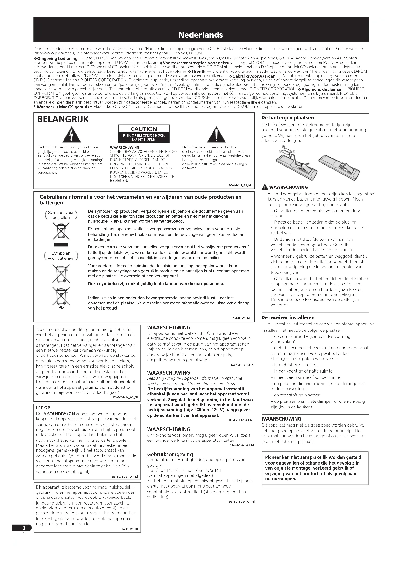 D3-4-2-1-4*_A1_Nl WAARSCHUWING Om brand te voorkomen, mag u geen open vuur (zoals een brandende kaars) op de apparatuur zetten.D3-4-2-1-7a_A1_Nl Gebruiksomgeving Temperatuur en vochtigheidsgraad op de plaats van gebruik:+5 °C tot +35 °C, minder dan 85 % RH (ventilatieopeningen niet afgedekt)Zet het apparaat niet op een slecht geventileerde plaats en stel het apparaat ook niet bloot aan hoge vochtigheid of direct zonlicht (of sterke kunstmatige verlichting).D3-4-2-1-7c*_A1_NlPioneer kan niet aansprakelijk worden gesteld voor ongevallen of schade die het gevolg zijn van onjuiste montage, verkeerd gebruik of wijziging van het product, of als gevolg van natuurrampen.English Français Italiano Español Nederlands Deutsch