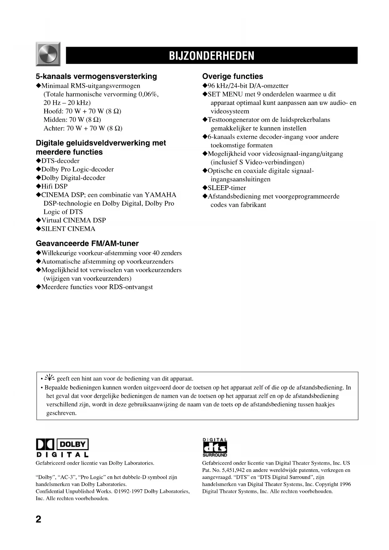 BIJZONDERHEDEN 5-kanaals vermogensversterking ◆ Minimaal RMS-uitgangsvermogen (Totale harmonische vervorming 0,06%, 20 Hz – 20 kHz) Hoofd: 70 W + 70 W (8 Ω) Midden: 70 W (8 Ω) Achter: 70 W + 70 W (8 Ω) Digitale geluidsveldverwerking met meerdere functies ◆ DTS-decoder ◆ Dolby Pro Logic-decoder ◆ Dolby Digital-decoder ◆ Hifi DSP ◆ CINEMA DSP; een combinatie van YAMAHA DSP-technologie en Dolby Digital, Dolby Pro Logic of DTS ◆ Virtual CINEMA DSP ◆ SILENT CINEMA Geavanceerde FM/AM-tuner ◆ Willekeurige voorkeur-afstemming voor 40 zenders ◆ Automatische afstemming op voorkeurzenders ◆ Mogelijkheid tot verwisselen van voorkeurzenders (wijzigen van voorkeurzenders) ◆ Meerdere functies voor RDS-ontvangst Overige functies ◆ 96 kHz/24-bit D/A-omzetter ◆ SET MENU met 9 onderdelen waarmee u dit apparaat optimaal kunt aanpassen aan uw audio- en videosysteem ◆ Testtoongenerator om de luidsprekerbalans gemakkelijker te kunnen instellen ◆ 6-kanaals externe decoder-ingang voor andere toekomstige formaten ◆ Mogelijkheid voor videosignaal-ingang/uitgang (inclusief S Video-verbindingen) ◆ Optische en coaxiale digitale signaal- ingangsaansluitingen ◆ SLEEP-timer ◆ Afstandsbediening met voorgeprogrammeerde codes van fabrikant Gefabriceerd onder licentie van Dolby Laboratories.“Dolby”, “AC-3”, “Pro Logic” en het dubbele-D symbool zijnhandelsmerken van Dolby Laboratories.Confidential Unpublished Works. ©1992-1997 Dolby Laboratories,Inc. Alle rechten voorbehouden.Gefabriceerd onder licentie van Digital Theater Systems, Inc. USPat. No. 5,451,942 en andere wereldwijde patenten, verkregen enaangevraagd. “DTS” en “DTS Digital Surround”, zijnhandelsmerken van Digital Theater Systems, Inc. Copyright 1996Digital Theater Systems, Inc. Alle rechten voorbehouden.• y geeft een hint aan voor de bediening van dit apparaat.• Bepaalde bedieningen kunnen worden uitgevoerd door de toetsen op het apparaat zelf of die op de afstandsbediening. Inhet geval dat voor dergelijke bedieningen de namen van de toetsen op het apparaat zelf en op de afstandsbedieningverschillend zijn, wordt in deze gebruiksaanwijzing de naam van de toets op de afstandsbediening tussen haakjesgeschreven.
