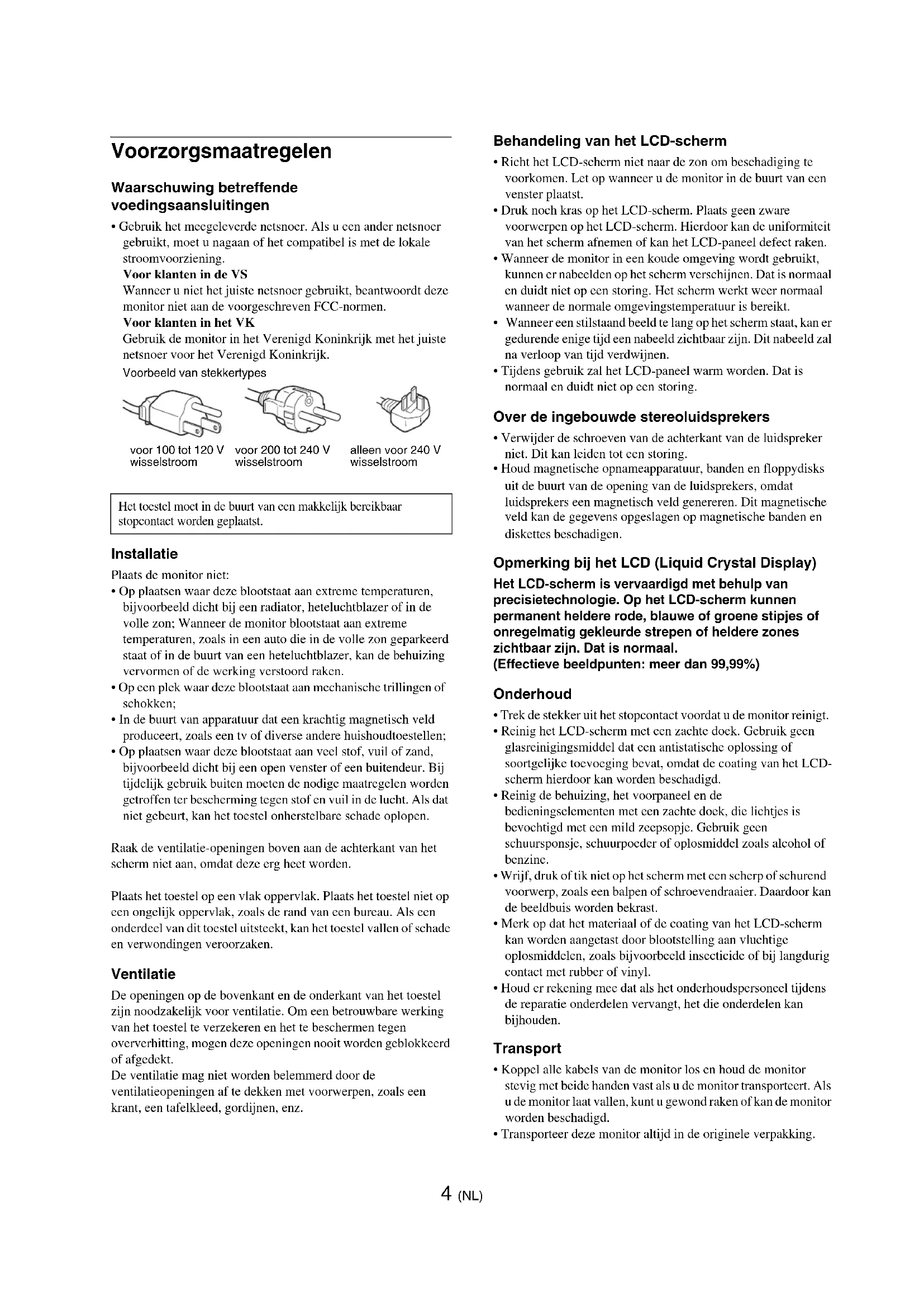 - Bovendien worden "™" en "®" niet elke keer vermeld in deze gebruiksaanwijzing. http://www.sony.net/ 3 (NL) Voorzorgsmaatregelen . . . . . . . . . . . . . . . . . . . . . . . . . . . . . . . . . . . 4 Plaats en functie van de bedieningsorganen . . . . . . . . . . . . . . . . . . 6 Installatie . . . . . . . . . . . . . . . . . . . . . . . . . . . . . . . . . . . . . .8 Stap 1: Gebruik de stand . . . . . . . . . . . . . . . . . . . . . . . . . . . . . . . . . 8 Stap 2: Het scherm aansluiten op de computer . . . . . . . . . . . . . . . . 8 Stap 3: Het netsnoer aansluiten. . . . . . . . . . . . . . . . . . . . . . . . . . . . 9 Stap 4: De snoeren bevestigen . . . . . . . . . . . . . . . . . . . . . . . . . . . . 9 Stap 5: De monitor en de computer aanzetten . . . . . . . . . . . . . . . . 9 De hellingshoek instellen . . . . . . . . . . . . . . . . . . . . . . . . . . . . . . . . 10 Het ingangssignaal selecteren (INPUT toets). . . . . . . . . . . . . . . . . 10 De monitor instellen . . . . . . . . . . . . . . . . . . . . . . . . . . . .11 Het menu gebruiken . . . . . . . . . . . . . . . . . . . . . . . . . . . . . . . . . . . . 11 De MODUS instellen (BEELDMODUS) . . . . . . . . . . . . . . . . . . . . . 11 BEELD menu . . . . . . . . . . . . . . . . . . . . . . . . . . . . . . . . . . . . . . 12 AUDIO menu . . . . . . . . . . . . . . . . . . . . . . . . . . . . . . . . . . . . . . . 14 SCHERM menu (alleen voor analoog RGB-signaal) . . . . . . . . 15 POSITIE MENU menu . . . . . . . . . . . . . . . . . . . . . . . . . . . . . . . 17 INGANG ZOEKEN menu . . . . . . . . . . . . . . . . . . . . . . . . . . . . . 17 LANGUAGE menu . . . . . . . . . . . . . . . . . . . . . . . . . . . . . . . . . . 17 0 RESET menu (terugzetten naar de standaardinstelling). . . . . . 18 TOETSEN SLOT menu . . . . . . . . . . . . . . . . . . . . . . . . . . . . . 18 Technische kenmerken . . . . . . . . . . . . . . . . . . . . . . . . . .18 Het volume bedienen . . . . . . . . . . . . . . . . . . . . . . . . . . . . . . . . . . . 18 Energiespaarfunctie . . . . . . . . . . . . . . . . . . . . . . . . . . . . . . . . . . . . 19 Functie voor het automatisch aanpassen van de beeldkwaliteit (alleen voor analoog RGB-signaal). . . . . . . . . . . . . . . . . . . . . . . . . 19 Problemen oplossen . . . . . . . . . . . . . . . . . . . . . . . . . . . .20 Schermberichten. . . . . . . . . . . . . . . . . . . . . . . . . . . . . . . . . . . . . . . 20 Problemen en oplossingen . . . . . . . . . . . . . . . . . . . . . . . . . . . . . . . 21 Technische gegevens . . . . . . . . . . . . . . . . . . . . . . . . . . .234 (NL) Voorzorgsmaatregelen Waarschuwing betreffende voedingsaansluitingen