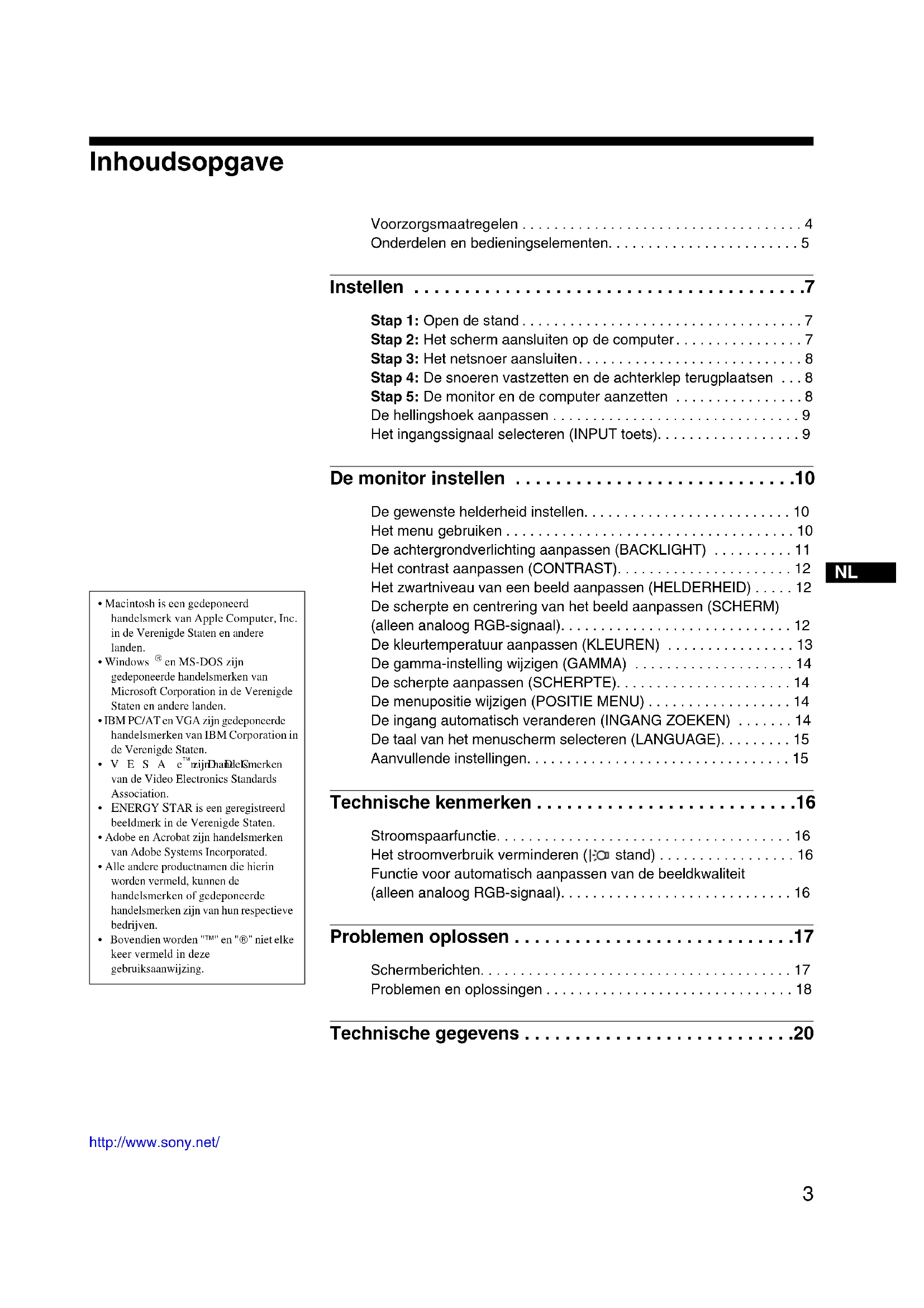 Instellen Voordat u de monitor in gebruik neemt, moet u controleren of de verpakking de volgende onderdelen bevat:• LCD-scherm•Netsnoer• HD15-HD15-videosignaalkabel (analoog RGB)• DVI-D videosignaalkabel (digitale RGB)• Snoerklem• CD-ROM (hulpprogramma's voor Windows/Macintosh, gebruiksaanwijzing, enzovoort)• Garantiekaart• Installatiehandleiding Stap 1:Open de stand OpmerkingDe stand is opgeklapt wanneer hij uit de fabriek komt. Plaats het scherm niet verticaal als de stand is opgeklapt. Indien u dat toch doet, kan het scherm omvallen. Stap 2:Het scherm aansluiten op de computer Zet de monitor en de computer uit voordat u deze aansluit.Opmerkingen• Raak de pinnen van de videosignaalkabel niet aan omdat deze hierdoor kunnen verbuigen.• Controleer de uitlijning van de HD15 aansluiting om te voorkomen dat de pinnen van de videosignaalkabel worden verbogen. Een computer aansluiten die is voorzien van een DVI uitgang (digitaal RGB) Gebruik de bijgeleverde DVI-D-videosignaalkabel (digitale RGB) om de computer aan te sluiten op de DVI-D-ingang van de monitor (digitale RGB). Een computer aansluiten die is voorzien van een HD15 uitgang (analoog RGB) Gebruik de bijgeleverde HD15-HD15-videosignaalkabel (analoog RGB) om de computer aan te sluiten op de HD15-ingang van de monitor (analoog RGB).Sluit de computer aan zoals hieronder wordt afgebeeld. x Aansluiting op een IBM PC/AT of vergelijkbare computer x Aansluiten op een Macintosh-computer Wanneer u de monitor aansluit op een Macintosh-computer, kunt u desgewenst de Macintosh-adapter (niet bijgeleverd) gebruiken. Sluit de Macintosh-adapter aan op de computer voordat u de kabel aansluit. naar de DVI uitgang (digitaal RGB) van de computernaar de DVI-D ingang (digitaal RGB)DVI-D videosignaalkabel (digitaal RGB) (bijgeleverd)IBM PC/AT of vergelijkbare computerHD15-HD15 videosignaalkabel (analoog RGB) (bijgeleverd)naar de HD15 uitgang (analoog RGB) van de computernaar de HD15 ingang (analoog RGB) Macintosh-computerHD15-HD15 videosignaalkabel (analoog RGB) (bijgeleverd)naar de uitgang van de computernaar de HD15 ingang (analoog RGB)8 Stap 3:Het netsnoer aansluiten Als de monitor en de computer zijn uitgeschakeld, moet u eerst het netsnoer aansluiten op de monitor en vervolgens op het stopcontact. Stap 4:De snoeren vastzetten en de achterklep terugplaatsen 1 De kabels en snoeren bundelen. Bundel de kabels en snoeren met de bijgeleverde snoerklem. 2 Plaats de achterklep terug. Stap 5:De monitor en de computer aanzetten 1 Druk de 1 (aan/uit) schakelaar omhoog. Het 1 (aan/uit) lampje van de monitor gaat groen branden. 2 Zet de computer aan. De installatie van de monitor is voltooid. Gebruik desgewenst de bedieningselementen op de monitor om het beeld aan te passen. Als er geen beeld verschijnt op het scherm