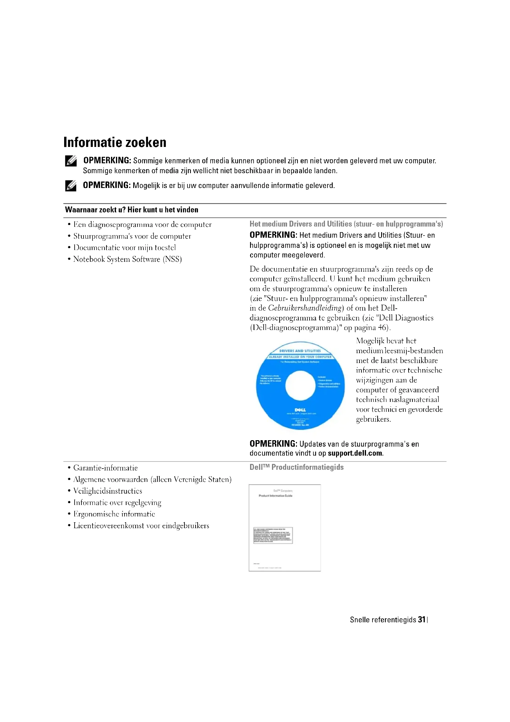 - Het besturingssysteem opnieuw installeren Medium met besturingssysteem OPMERKING: Het medium met het besturingssysteem kan optioneel zijn en is wellicht niet meegeleverd met uw computer. Het besturingssysteem is reeds op de computer geïnstalleerd. Wanneer u het besturingssysteem opnieuw wilt installeren, moet u het medium met het besturingssysteem gebruiken. Raadpleeg "Het besturingssysteem herstellen" in de on line Gebruikershandleiding. Nadat u uw besturingssysteem opnieuw hebt geïnstalleerd, gebruikt u het optionele medium Drivers and Utilities (stuur- en hulpprogramma's) om de stuurprogramma's opnieuw te installeren voor de apparaten die zijn meegeleverd met uw computer. Het productsleutellabel voor het besturingssysteem bevindt zich op de computer. OPMERKING: De kleur van de cd of dvd is afhankelijk van het besturingssysteem dat u hebt besteld. Waarnaar zoekt u? Hier kunt u het vindenSnelle referentiegids 35 De computer instellen WAARSCHUWING: Voordat u aan een van de procedures in deze sectie begint, dient u de veiligheidsinstructies te volgen die u vindt in de Productinformatiegids