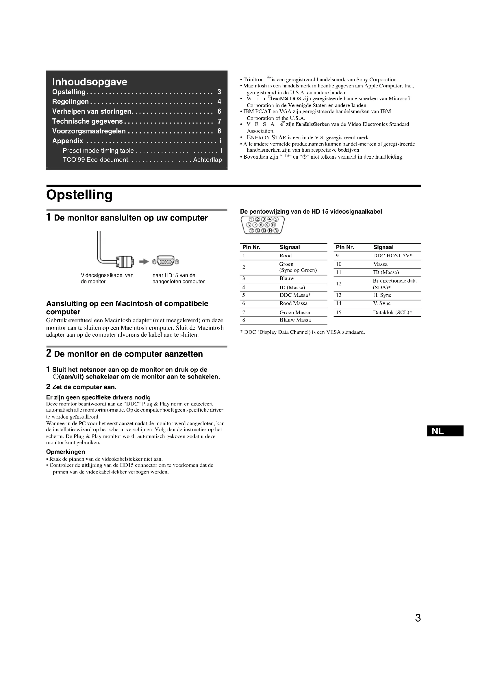 - Trinitron is een geregistreerd handelsmerk van Sony Corporation.• Macintosh is een handelsmerk in licentie gegeven aan Apple Computer, Inc., geregistreerd in de U.S.A. en andere landen.•Windows en MS-DOS zijn geregisteerde handelsmerken van Microsoft Corporation in de Verenigde Staten en andere landen.• IBM PC/AT en VGA zijn geregistreerde handelsmerken van IBM Corporation of the U.S.A.•VESA en DDC zijn handelsmerken van de Video Electronics Standard Association. ENERGY STAR is een in de V.S. geregistreerd merk.• Alle andere vermelde productnamen kunnen handelsmerken of geregistreerde handelsmerken zijn van hun respectieve bedrijven. • Bovendien zijn “ ä” en “â” niet telkens vermeld in deze handleiding. Opstelling 1 De monitor aansluiten op uw computer Aansluiting op een Macintosh of compatibele computer Gebruik eventueel een Macintosh adapter (niet meegeleverd) om deze monitor aan te sluiten op een Macintosh computer. Sluit de Macintosh adapter aan op de computer alvorens de kabel aan te sluiten. 2 De monitor en de computer aanzetten 1 Sluit het netsnoer aan op de monitor en druk op de 1 (aan/uit) schakelaar om de monitor aan te schakelen. 2 Zet de computer aan. Er zijn geen specifieke drivers nodigDeze monitor beantwoordt aan de “DDC” Plug & Play norm en detecteert automatisch alle monitorinformatie. Op de computer hoeft geen specifieke driver te worden geïnstalleerd.Wanneer u de PC voor het eerst aanzet nadat de monitor werd aangesloten, kan de installatie-wizard op het scherm verschijnen. Volg dan de instructies op het scherm. De Plug & Play monitor wordt automatisch gekozen zodat u deze monitor kunt gebruiken.Opmerkingen• Raak de pinnen van de videokabelstekker niet aan.• Controleer de uitlijning van de HD15 connector om te voorkomen dat de pinnen van de videokabelstekker verbogen worden.De pentoewijzing van de HD 15 videosignaalkabel* DDC (Display Data Channel) is een VESA standaard. Inhoudsopgave Opstelling. . . . . . . . . . . . . . . . . . . . . . . . . . . . . . . . . . 3 Regelingen . . . . . . . . . . . . . . . . . . . . . . . . . . . . . . . . . 4 Verhelpen van storingen. . . . . . . . . . . . . . . . . . . . . . 6 Technische gegevens . . . . . . . . . . . . . . . . . . . . . . . . 7 Voorzorgsmaatregelen . . . . . . . . . . . . . . . . . . . . . . . 8 Appendix . . . . . . . . . . . . . . . . . . . . . . . . . . . . . . . . . . . i Preset mode timing table . . . . . . . . . . . . . . . . . . . . . . . iTCO’99 Eco-document. . . . . . . . . . . . . . . . . . Achterflap Videosignaalkabel van de monitor naar HD15 van de aangesloten computer