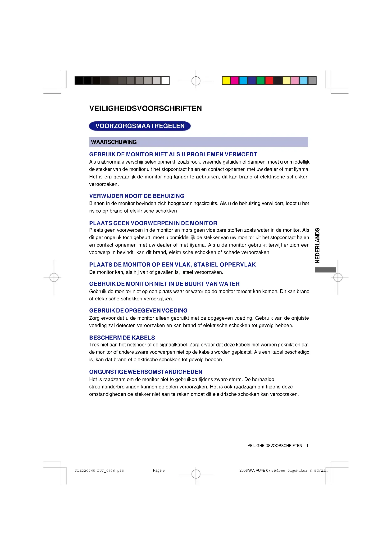 INHOUDSOPGAVE PLE2200WS-DUT_0906.p65 2006/9/7, ¤U¤È 07:59Page 3 Adobe PageMaker 6.5C/WinNEDERLANDS PLE2200WS-DUT_0906.p65 2006/9/7, ¤U¤È 07:59Page 4 Adobe PageMaker 6.5C/WinNEDERLANDS VEILIGHEIDSVOORSCHRIFTEN 1 VEILIGHEIDSVOORSCHRIFTEN WAARSCHUWING GEBRUIK DE MONITOR NIET ALS U PROBLEMEN VERMOEDT Als u abnormale verschijnselen opmerkt, zoals rook, vreemde geluiden of dampen, moet u onmiddellijk de stekker van de monitor uit het stopcontact halen en contact opnemen met uw dealer of met iiyama. Het is erg gevaarlijk de monitor nog langer te gebruiken, dit kan brand of elektrische schokken veroorzaken.