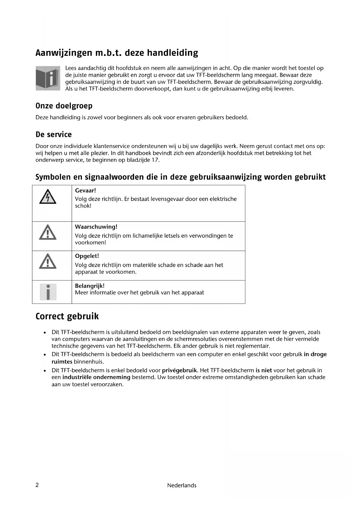 Waarschuwing! Volg deze richtlijn om lichamelijke letsels en verwondingen te voorkomen! Opgelet! Volg deze richtlijn om materiële schade en schade aan het apparaat te voorkomen. Belangrijk! Meer informatie over het gebruik van het apparaat Correct gebruik Dit TFT-beeldscherm is uitsluitend bedoeld om beeldsignalen van externe apparaten weer te geven, zoals van computers waarvan de aansluitingen en de schermresoluties overeenstemmen met de hier vermelde technische gegevens van het TFT-beeldscherm. Elk ander gebruik is niet reglementair. Dit TFT-beeldscherm is bedoeld als beeldscherm van een computer en enkel geschikt voor gebruik in droge ruimtes binnenhuis. Dit TFT-beeldscherm is enkel bedoeld voor privégebruik. Het TFT-beeldscherm is niet voor het gebruik in een industriële onderneming bestemd. Uw toestel onder extreme omstandigheden gebruiken kan schade aan uw toestel veroorzaken.Omvang van de levering