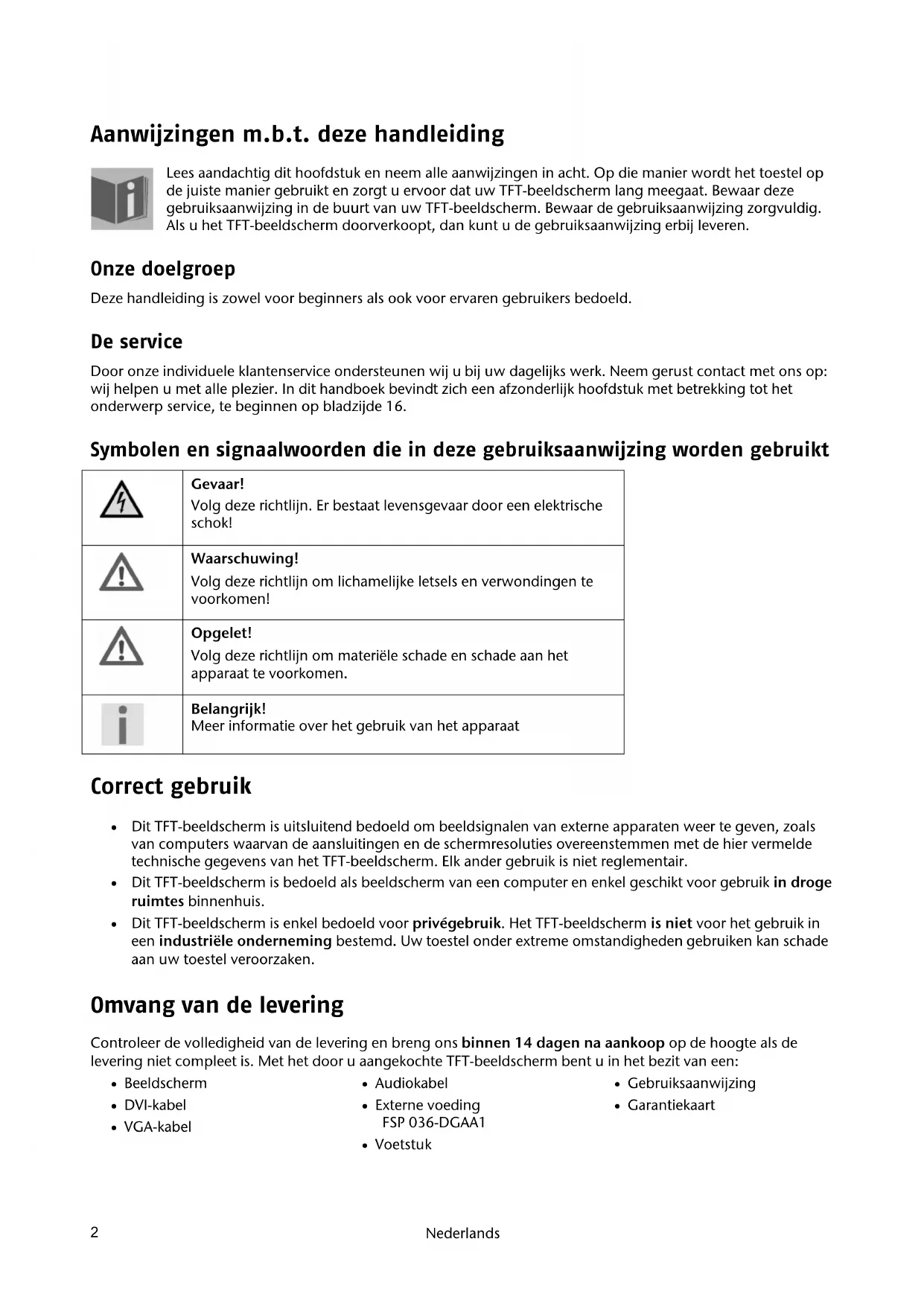 Aanwijzingen m.b.t. deze handleiding Lees aandachtig dit hoofdstuk en neem alle aanwijzingen in acht. Op die manier wordt het toestel op de juiste manier gebruikt en zorgt u ervoor dat uw TFT-beeldscherm lang meegaat. Bewaar deze gebruiksaanwijzing in de buurt van uw TFT-beeldscherm. Bewaar de gebruiksaanwijzing zorgvuldig. Als u het TFT-beeldscherm doorverkoopt, dan kunt u de gebruiksaanwijzing erbij leveren. Onze doelgroep Deze handleiding is zowel voor beginners als ook voor ervaren gebruikers bedoeld. De service Door onze individuele klantenservice ondersteunen wij u bij uw dagelijks werk. Neem gerust contact met ons op: wij helpen u met alle plezier. In dit handboek bevindt zich een afzonderlijk hoofdstuk met betrekking tot het onderwerp service, te beginnen op bladzijde 16. Symbolen en signaalwoorden die in deze gebruiksaanwijzing worden gebruikt Gevaar! Volg deze richtlijn. Er bestaat levensgevaar door een elektrische schok! Waarschuwing! Volg deze richtlijn om lichamelijke letsels en verwondingen te voorkomen! Opgelet! Volg deze richtlijn om materiële schade en schade aan het apparaat te voorkomen. Belangrijk! Meer informatie over het gebruik van het apparaat Correct gebruik Dit TFT-beeldscherm is uitsluitend bedoeld om beeldsignalen van externe apparaten weer te geven, zoals van computers waarvan de aansluitingen en de schermresoluties overeenstemmen met de hier vermelde technische gegevens van het TFT-beeldscherm. Elk ander gebruik is niet reglementair. Dit TFT-beeldscherm is bedoeld als beeldscherm van een computer en enkel geschikt voor gebruik in droge ruimtes binnenhuis. Dit TFT-beeldscherm is enkel bedoeld voor privégebruik. Het TFT-beeldscherm is niet voor het gebruik in een industriële onderneming bestemd. Uw toestel onder extreme omstandigheden gebruiken kan schade aan uw toestel veroorzaken. Omvang van de levering Controleer de volledigheid van de levering en breng ons binnen 14 dagen na aankoop op de hoogte als de levering niet compleet is. Met het door u aangekochte TFT-beeldscherm bent u in het bezit van een: Beeldscherm DVI-kabel VGA-kabel Audiokabel Externe voeding FSP 036-DGAA1 Voetstuk Gebruiksaanwijzing GarantiekaartVeiligheidsadviezen