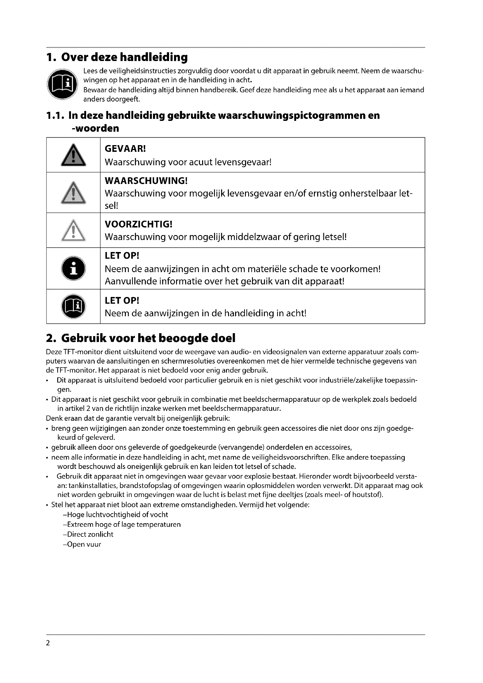 Deze TFT-monitor dient uitsluitend voor de weergave van audio- en videosignalen van externe apparatuur zoals com- puters waarvan de aansluitingen en schermresoluties overeenkomen met de hier vermelde technische gegevens van de TFT-monitor. Het apparaat is niet bedoeld voor enig ander gebruik.