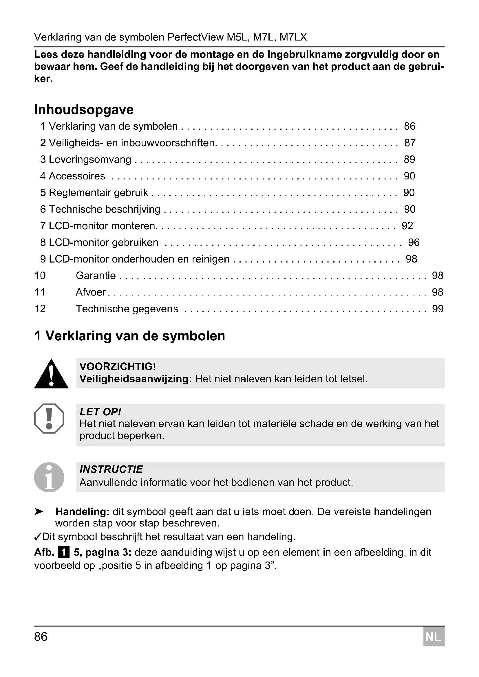 ➤ Handeling: dit symbool geeft aan dat u iets moet doen. De vereiste handelingen worden stap voor stap beschreven. ✓ Dit symbool beschrijft het resultaat van een handeling. Afb. 1 5, pagina 3: deze aanduiding wijst u op een element in een afbeelding, in dit voorbeeld op „positie 5 in afbeelding 1 op pagina 3”. VOORZICHTIG! Veiligheidsaanwijzing: Het niet naleven kan leiden tot letsel. LET OP! Het niet naleven ervan kan leiden tot materiële schade en de werking van het product beperken. INSTRUCTIE Aanvullende informatie voor het bedienen van het product.PerfectView M5L, M7L, M7LX Veiligheids- en inbouwvoorschriften