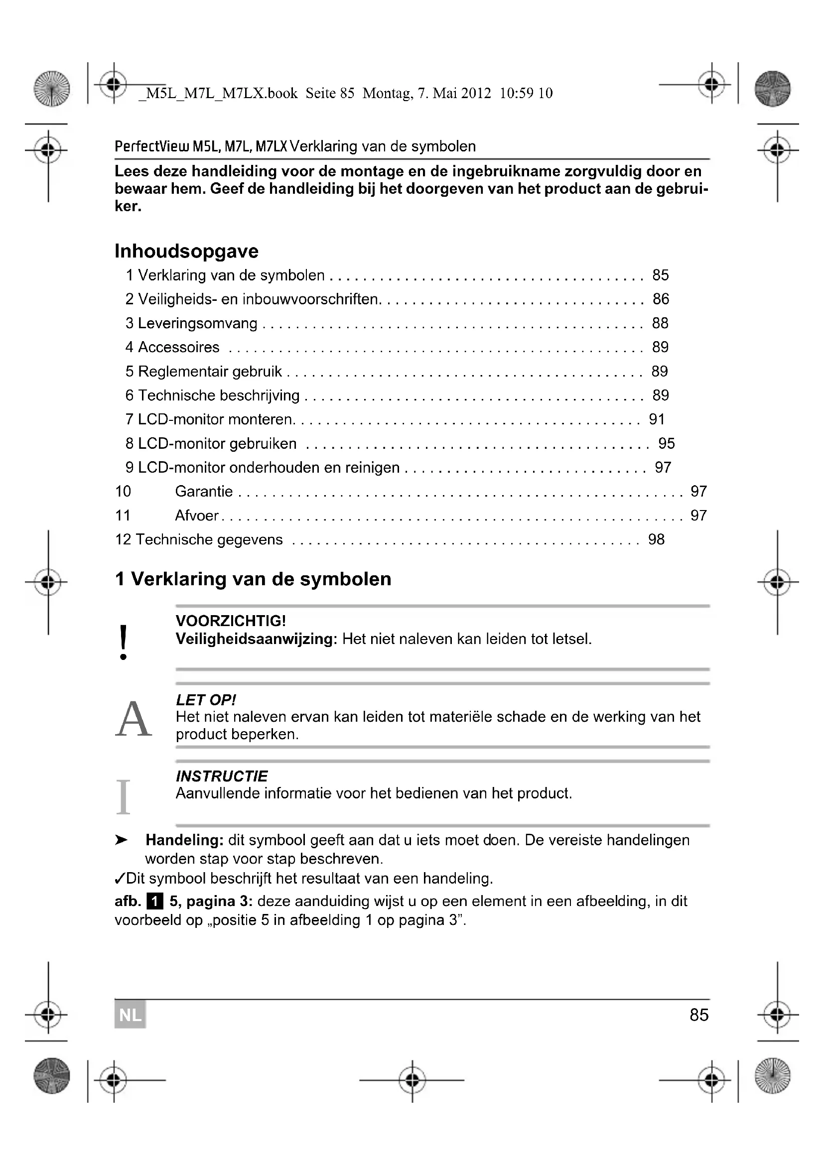 INSTRUCTIE Aanvullende informatie voor het bedienen van het product. ➤ Handeling: dit symbool geeft aan dat u iets moet doen. De vereiste handelingen worden stap voor stap beschreven. ✓ Dit symbool beschrijft het resultaat van een handeling. afb. 1 5, pagina 3: deze aanduiding wijst u op een element in een afbeelding, in dit voorbeeld op „positie 5 in afbeelding 1 op pagina 3”. _M5L_M7L_M7LX.book Seite 85 Montag, 7. Mai 2012 10:59 10Veiligheids- en inbouwvoorschriften PerfectView M5L, M7L, M7LX