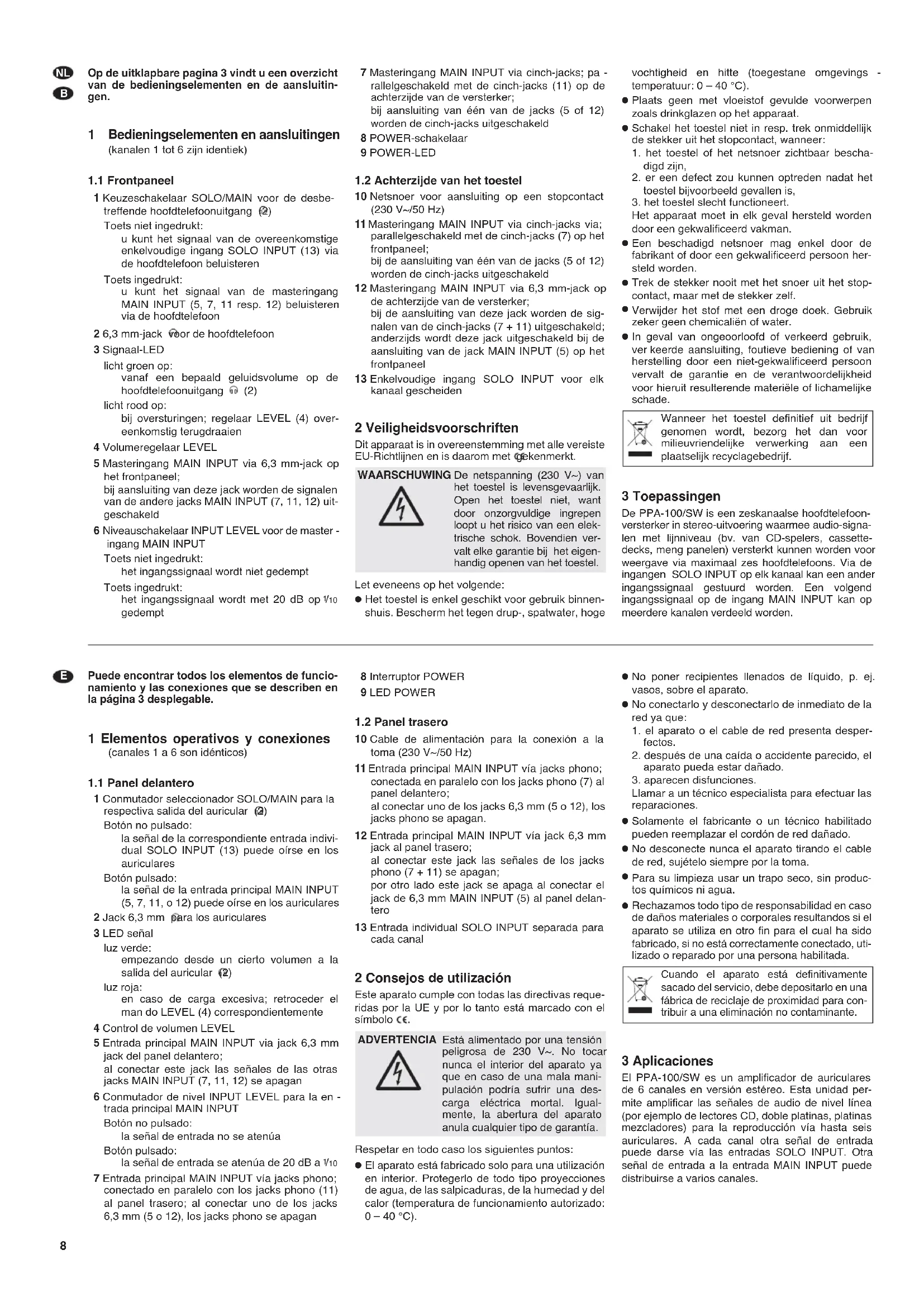 PPA-100/SW is een zeskanaalse hoofdtelefoon- versterker in stereo-uitvoering waarmee audio-signa- len met lijnniveau (bv. van CD-spelers, cassette- decks, meng panelen) versterkt kunnen worden voor weergave via maximaal zes hoofdtelefoons. Via de ingangen SOLO INPUT op elk kanaal kan een ander ingangssignaal gestuurd worden. Een volgend ingangssignaal op de ingang MAIN INPUT kan op meerdere kanalen verdeeld worden. Wanneer het toestel definitief uit bedrijf genomen wordt, bezorg het dan voor milieuvriendelijke verwerking aan een plaatselijk recyclagebedrijf. WAARSCHUWING De netspanning (230 V~) van het toestel is levensgevaarlijk. Open het toestel niet, want door onzorgvuldige ingrepen loopt u het risico van een elek- trische schok. Bovendien ver- valt elke garantie bij het eigen- handig openen van het toestel. Puede encontrar todos los elementos de funcio- namiento y las conexiones que se describen en la página 3 desplegable. 1 Elementos operativos y conexiones (canales 1 a 6 son idénticos)