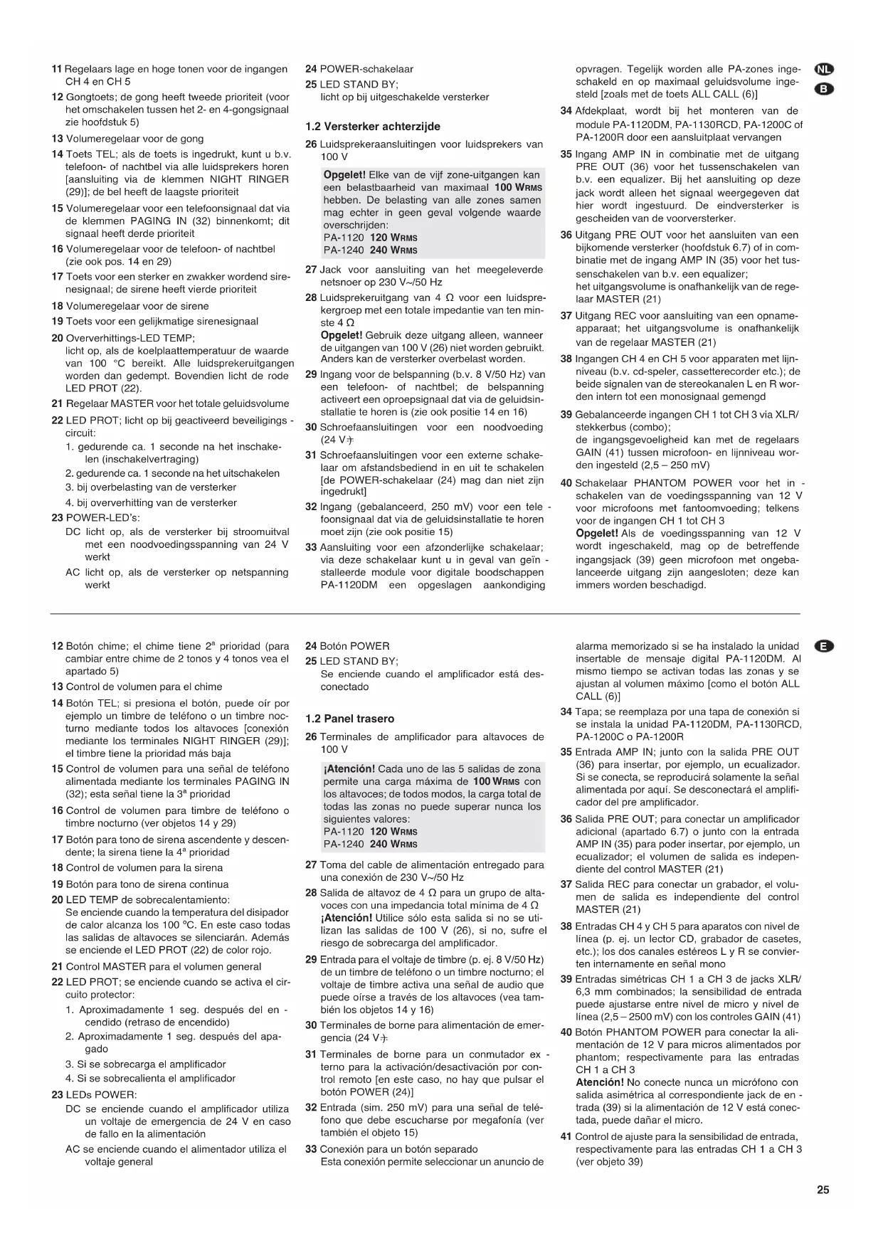 26 Luidsprekeraansluitingen voor luidsprekers van 100 V 27 Jack voor aansluiting van het meegeleverde netsnoer op 230 V~/50 Hz 28 Luidsprekeruitgang van 4 Ω voor een luidspre- kergroep met een totale impedantie van ten min- ste 4 Ω Opgelet! Gebruik deze uitgang alleen, wanneer de uitgangen van 100 V (26) niet worden gebruikt. Anders kan de versterker overbelast worden. 29 Ingang voor de belspanning (b.v. 8 V/50 Hz) van een telefoon- of nachtbel; de belspanning activeert een oproepsignaal dat via de geluidsin- stallatie te horen is (zie ook positie 14 en 16) 30 Schroefaansluitingen voor een noodvoeding (24 V ) 31 Schroefaansluitingen voor een externe schake- laar om afstandsbediend in en uit te schakelen [de POWER-schakelaar (24) mag dan niet zijn ingedrukt] 32 Ingang (gebalanceerd, 250 mV) voor een tele - foonsignaal dat via de geluidsinstallatie te horen moet zijn (zie ook positie 15) 33 Aansluiting voor een afzonderlijke schakelaar; via deze schakelaar kunt u in geval van geïn - stalleerde module voor digitale boodschappen PA-1120DM een opgeslagen aankondiging opvragen. Tegelijk worden alle PA-zones inge- schakeld en op maximaal geluidsvolume inge- steld [zoals met de toets ALL CALL (6)] 34 Afdekplaat, wordt bij het monteren van de module PA-1120DM, PA-1130RCD, PA-1200C of PA-1200R door een aansluitplaat vervangen 35 Ingang AMP IN in combinatie met de uitgang PRE OUT (36) voor het tussenschakelen van b.v. een equalizer. Bij het aansluiting op deze jack wordt alleen het signaal weergegeven dat hier wordt ingestuurd. De eindversterker is gescheiden van de voorversterker. 36 Uitgang PRE OUT voor het aansluiten van een bijkomende versterker (hoofdstuk 6.7) of in com- binatie met de ingang AMP IN (35) voor het tus- senschakelen van b.v. een equalizer; het uitgangsvolume is onafhankelijk van de rege- laar MASTER (21) 37 Uitgang REC voor aansluiting van een opname- apparaat; het uitgangsvolume is onafhankelijk van de regelaar MASTER (21) 38 Ingangen CH 4 en CH 5 voor apparaten met lijn- niveau (b.v. cd-speler, cassetterecorder etc.); de beide signalen van de stereokanalen L en R wor- den intern tot een monosignaal gemengd 39 Gebalanceerde ingangen CH 1 tot CH 3 via XLR/ stekkerbus (combo); de ingangsgevoeligheid kan met de regelaars GAIN (41) tussen microfoon- en lijnniveau wor- den ingesteld (2,5 – 250 mV) 40 Schakelaar PHANTOM POWER voor het in - schakelen van de voedingsspanning van 12 V voor microfoons met fantoomvoeding; telkens voor de ingangen CH 1 tot CH 3 Opgelet! Als de voedingsspanning van 12 V wordt ingeschakeld, mag op de betreffende ingangsjack (39) geen microfoon met ongeba- lanceerde uitgang zijn aangesloten; deze kan immers worden beschadigd. Opgelet! Elke van de vijf zone-uitgangen kan een belastbaarheid van maximaal 100 WRMS hebben. De belasting van alle zones samen mag echter in geen geval volgende waarde overschrijden: PA-1120 120 WRMS PA-1240 240 WRMS 12 Botón chime; el chime tiene 2ª prioridad (para cambiar entre chime de 2 tonos y 4 tonos vea el apartado 5) 13 Control de volumen para el chime 14 Botón TEL; si presiona el botón, puede oír por ejemplo un timbre de teléfono o un timbre noc- turno mediante todos los altavoces [conexión mediante los terminales NIGHT RINGER (29)]; el timbre tiene la prioridad más baja 15 Control de volumen para una señal de teléfono alimentada mediante los terminales PAGING IN (32); esta señal tiene la 3ª prioridad 16 Control de volumen para timbre de teléfono o timbre nocturno (ver objetos 14 y 29) 17 Botón para tono de sirena ascendente y descen- dente; la sirena tiene la 4ª prioridad 18 Control de volumen para la sirena 19 Botón para tono de sirena continua 20 LED TEMP de sobrecalentamiento: Se enciende cuando la temperatura del disipador de calor alcanza los 100 ºC. En este caso todas las salidas de altavoces se silenciarán. Además se enciende el LED PROT (22) de color rojo. 21 Control MASTER para el volumen general 22 LED PROT; se enciende cuando se activa el cir- cuito protector: