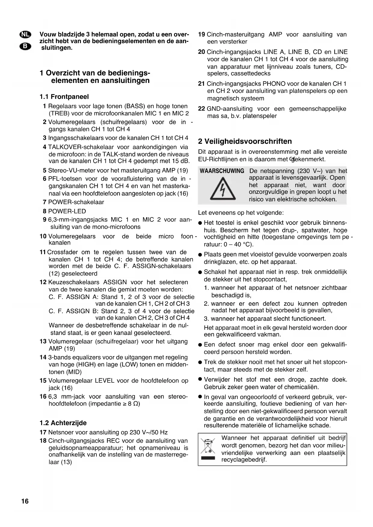 Plaats alle toonregelaars (10 en 14) in de middelste stand en de TALKOVER-schakelaar (4) in de OFF-stand, alvorens het mengpaneel een eerste keer in gebruik te nemen. Plaats beide C.F. ASSIGN-schakelaars (12) in de nulstand (mix-functie is uitgeschakeld).
