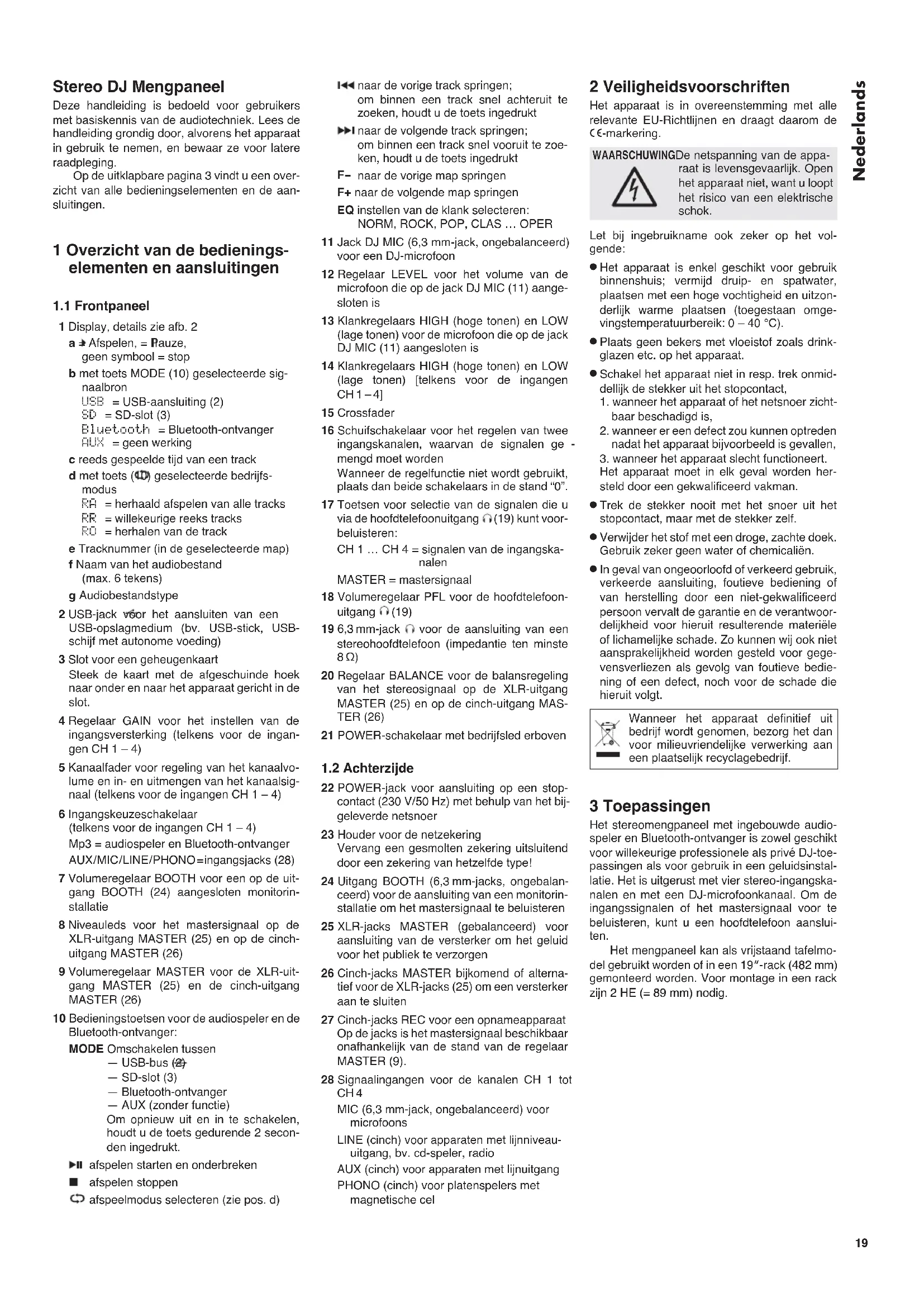 Het stereomengpaneel met ingebouwde audiospeler en Bluetooth-ontvanger is zowel geschikt voor willekeurige professionele als privé DJ-toepasseningen als voor gebruik in een geluidinstallatie. Het is uitergerust met vier stereo-ingangskanaalen en met een DJ-microfoonkanaal. Om de ingangssignalen of het mastersignaal voor te beluisteren, kut u een hoofdteleloon aansluten.