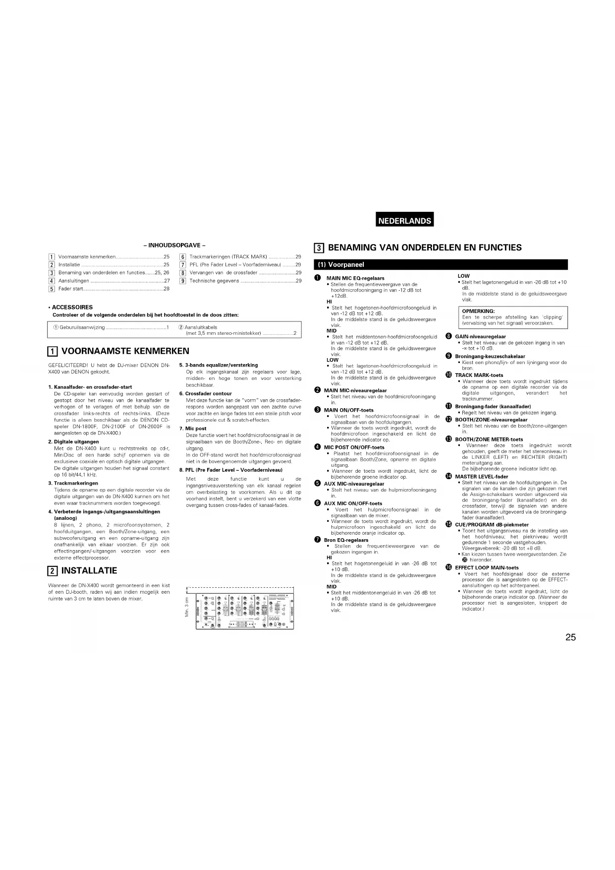 VOORNAAMSTE KENMERKEN GEFELICITEERD! U hebt de DJ-mixer DENON DN-X400 van DENON gekocht.1. Kanaalfader- en crossfader-startDe CD-speler kan eenvoudig worden gestart ofgestopt door het niveau van de kanaalfader teverhogen of te verlagen of met behulp van decrossfader links-rechts of rechts-links. (Dezefunctie is alleen beschikbaar als de DENON CD-speler DN-1800F, DN-2100F of DN-2600F isaangesloten op de DN-X400.)2. Digitale uitgangenMet de DN-X400 kunt u rechtstreeks op cd-r,MiniDisc of een harde schijf opnemen via deexclusieve coaxiale en optisch digitale uitgangen.De digitale uitgangen houden het signaal constantop 16 bit/44,1 kHz.3. TrackmarkeringenTijdens de opname op een digitale recorder via dedigitale uitgangen van de DN-X400 kunnen om heteven waar tracknummers worden toegevoegd.4. Verbeterde ingangs-/uitgangsaansluitingen(analoog)8 lijnen, 2 phono, 2 microfoonsystemen, 2hoofduitgangen, een Booth/Zone-uitgang, eensubwooferuitgang en een opname-uitgang zijnonafhankelijk van elkaar voorzien. Er zijn ookeffectingangen/-uitgangen voorzien voor eenexterne effectprocessor.5. 3-bands equalizer/versterkingOp elk ingangskanaal zijn regelaars voor lage,midden- en hoge tonen en voor versterkingbeschikbaar.6. Crossfader contourMet deze functie kan de “vorm” van de crossfader-respons worden aangepast van een zachte curvevoor zachte en lange fades tot een steile pitch voorprofessionele cut & scratch-effecten.7. Mic postDeze functie voert het hoofdmicrofoonsignaal in designaalbaan van de Booth/Zone-, Rec- en digitaleuitgang.In de OFF-stand wordt het hoofdmicrofoonsignaalniet in de bovengenoemde uitgangen gevoerd.8. PFL (Pre Fader Level – Voorfaderniveau)Met deze functie kunt u deingangsniveauversterking van elk kanaal regelenom overbelasting te voorkomen. Als u dit opvoorhand instelt, bent u verzekerd van een vlotteovergang tussen cross-fades of kanaal-fades.