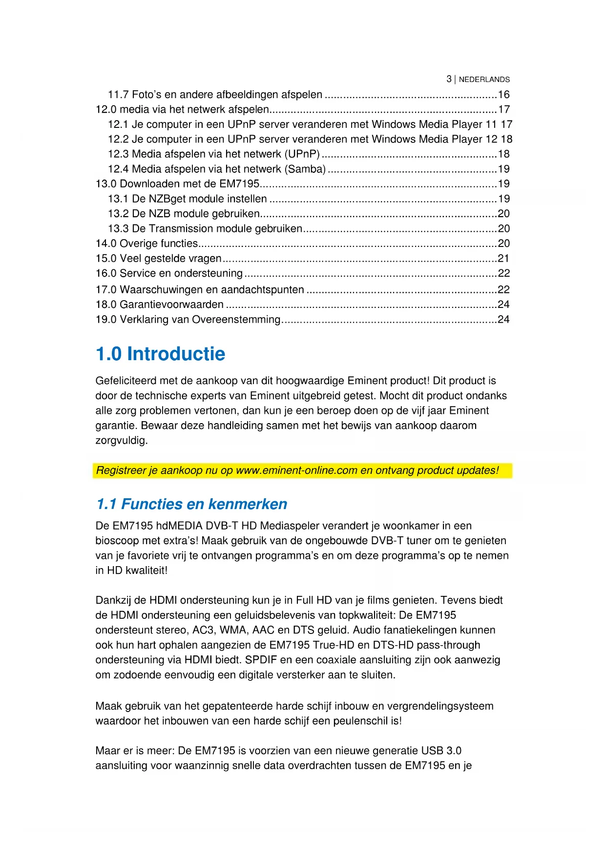 V: De hdMEDIA hdMEDIA DVB-T HD Media Speler stelt je in staat om een harde schijf in te bouwen. Is er een limiet aan de grootte van de schijf en wordt SATA II ondersteund? A: De EM7195 is getest met harde schijven t/m 2TB. Zowel SATA 1 als SATA II worden ondersteund. V: In de handleiding wordt aangegeven dat de mediaspeler veel media afspeelt. Welke formaten en codecs worden door de EM7195 ondersteund? A: The EM7195 kan werken met de volgende formaten en codecs: Video codec’s: WMVHD, AVCHD, H.264, X.264, VC-1, MPEG 1/2/3/4, MKV, M2TS, TS, ISO, AVI, MOV en vele andere formaten. Afbeelding formaten: HD JPEG, BMP, GIF, TIF, and PNG. Audio formaten: AAC, PCM, DOLBY AC3, DTS, DTS-HD (Pass through), Dolby True-HD (Pass through), AC3 and DTS stereo down mix. V: Bij ‘InstellingenSysteem’ wordt een ‘Startup Mode’ genoemd. Wat doet deze functie? A: Als ‘Media Center’ is geselecteerd, zal de mediaspeler standaard met het menu opstarten. Als ‘Set Top Box’ is geselecteerd, zal de mediaspeler opstarten met de digitale DVB-T tuner.22 | NEDERLANDS V: AVI wordt door de EM7195 ondersteund. Echter, AVI bestanden die door mijn digitale/DV camera zijn gemaakt, worden niet afgespeeld. Hoe kan dit? A: AVI bestanden die door een digitale/DV camera zijn gemaakt zijn normaliter voorzien van beveiligde en door de camerafabrikant afgeschermde codecs. Een mediaspeler heeft deze codecs niet aan boord en speelt deze derhalve niet af. De betreffende AVI’s dienen doorgaans geconverteerd te worden naar VI bestanden met reguliere codecs. Conversie programma’s kunnen via het internet worden gevonden. V: De EM7195 heeft een USB 3.0 aansluiting. Kan ik de USB 2.0 aansluiting op mijn computer wel gebruiken? A: Ja, je kunt de USB 2.0 poorten gebruiken. USB 3.0 is backwards compatible met USB 2.0. V: Ik heb een aantaI Blu-Ray ISO’s met DTS-HD of True-HD geluid. Kan de EM7195 hiermee overweg? A: De EM7195 heeft ondersteuning voor DTS-HD en Dolby True-HD pass- through via HDMI. Een externe versterker is noodzakelijk voor het volledige theater geluid. V: Welke kaarttypen worden door de interne kaarlezer ondersteund? A: De kaartlezer heeft ondersteuning voor SD en SDHC kaarten. V: Welke bestandssystemen worden door de EM7195 ondersteund? A: De EM7195 formatteert de interne schijf op het NTFS bestandssysteem. De EM7195 kan lezen van NTFS en FAT32 bestandssystemen.