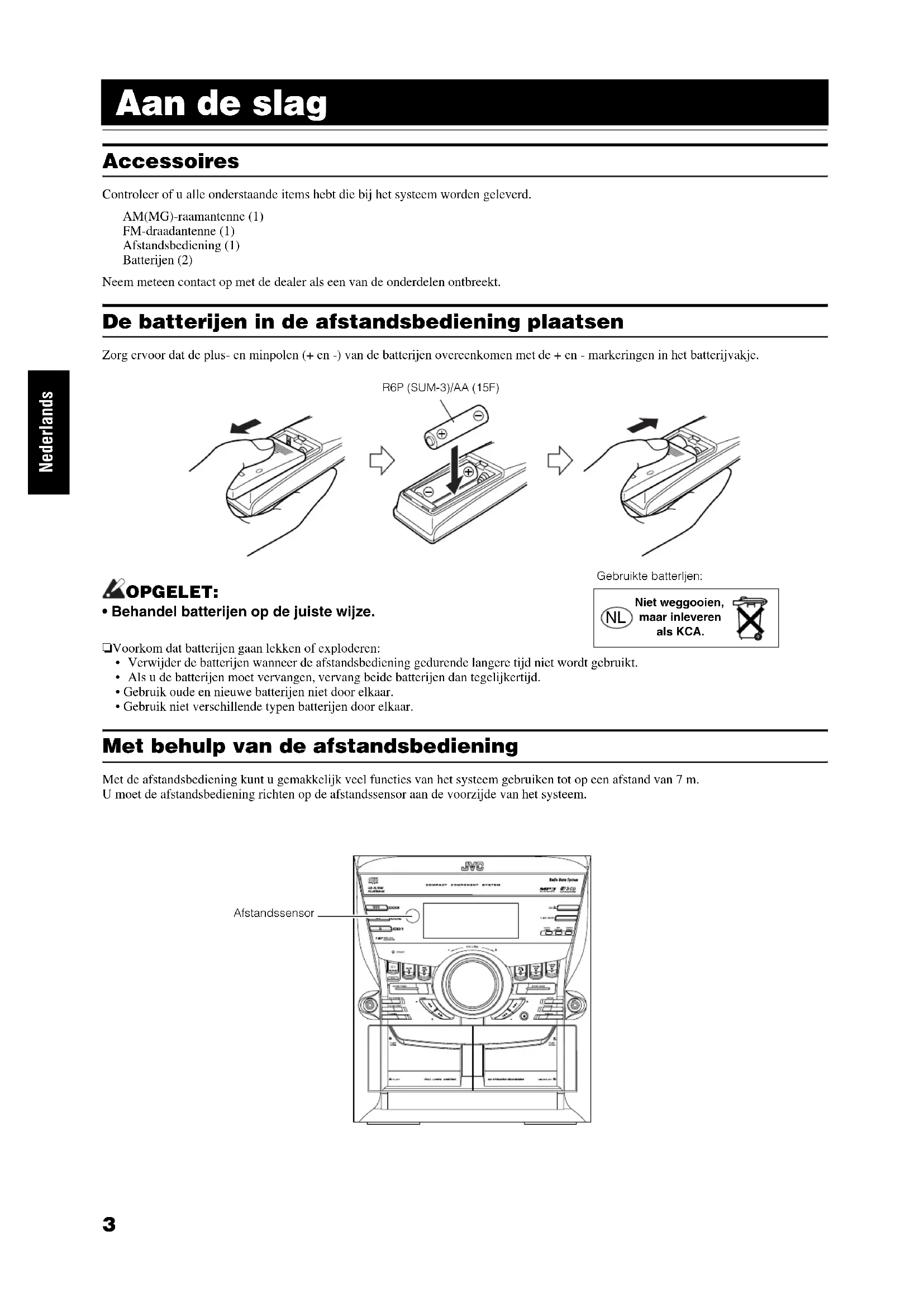 - Gebruik oude en nieuwe batterijen niet door elkaar.• Gebruik niet verschillende typen batterijen door elkaar. Met behulp van de afstandsbediening Met de afstandsbediening kunt u gemakkelijk veel functies van het systeem gebruiken tot op een afstand van 7 m. U moet de afstandsbediening richten op de afstandssensor aan de voorzijde van het systeem. R6P (SUM-3)/AA (15F)Afstandssensor Niet weggooien,maar inleverenals KCA.Gebruikte batterljen: MX-KC45(E)_NL.book Page 3 Thursday, April 6, 2006 6:48 PM4 Aan de slag Nederlands OPGELET: