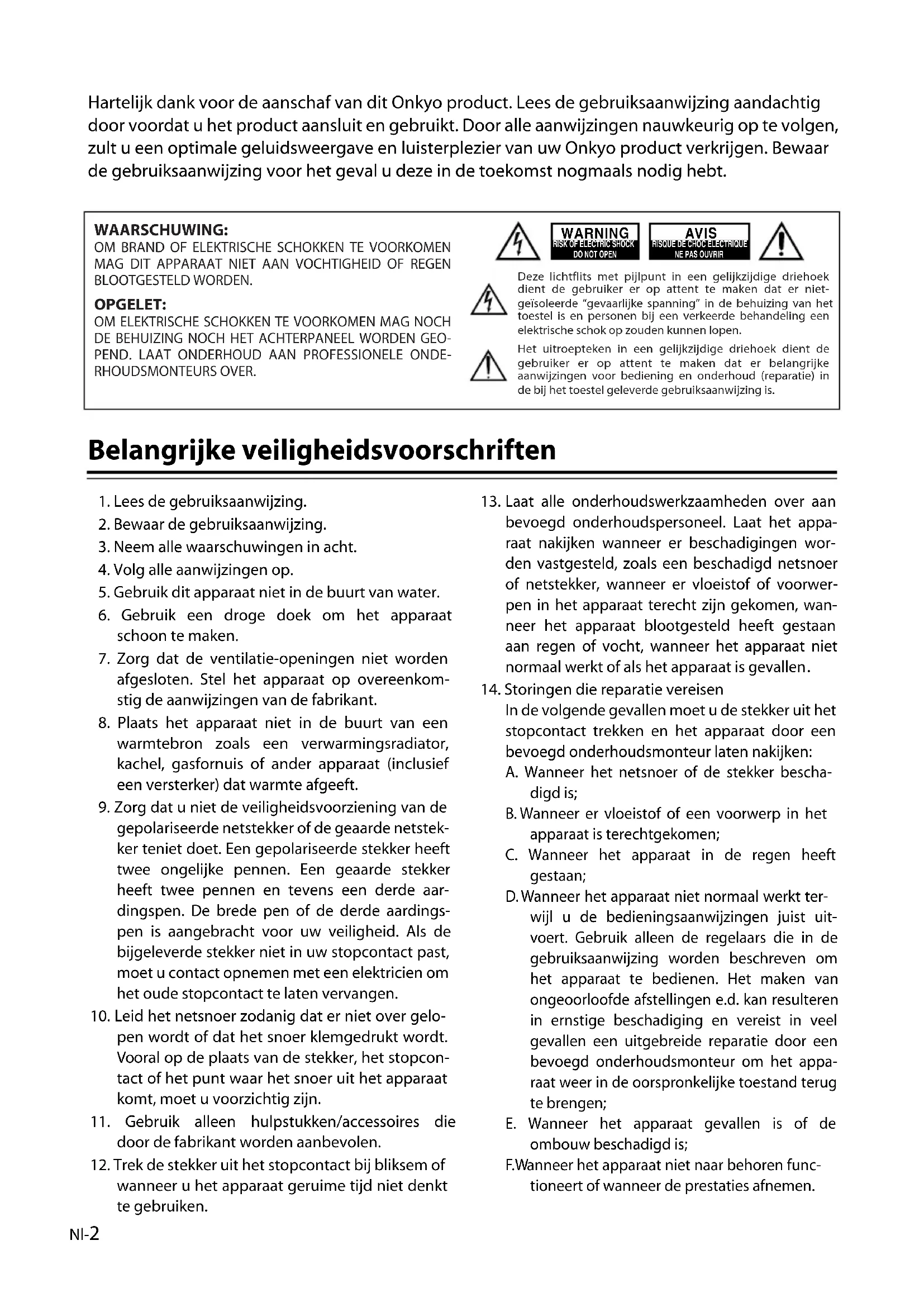 - In de volgende gevallen moet u de stekker uit het stopcontact trekken en het apparaat door een bevoegd onderhoudsmonteur laten nakijken: A. Wanneer het netsnoer of de stekker bescha- digd is; B. Wanneer er vloeistof of een voorwerp in het apparaat is terechtgekomen; C. Wanneer het apparaat in de regen heeft gestaan; D. Wanneer het apparaat niet normaal werkt ter- wijl u de bedieningsaanwijzingen juist uit- voert. Gebruik alleen de regelaars die in de gebruiksaanwijzing worden beschreven om het apparaat te bedienen. Het maken van ongeoorloofde afstellingen e.d. kan resulteren in ernstige beschadiging en vereist in veel gevallen een uitgebreide reparatie door een bevoegd onderhoudsmonteur om het appa- raat weer in de oorspronkelijke toestand terug te brengen; E. Wanneer het apparaat gevallen is of de ombouw beschadigd is; F. Wanneer het apparaat niet naar behoren func- tioneert of wanneer de prestaties afnemen. WAARSCHUWING: OM BRAND OF ELEKTRISCHE SCHOKKEN TE VOORKOMEN MAG DIT APPARAAT NIET AAN VOCHTIGHEID OF REGEN BLOOTGESTELD WORDEN. OPGELET: OM ELEKTRISCHE SCHOKKEN TE VOORKOMEN MAG NOCH DE BEHUIZING NOCH HET ACHTERPANEEL WORDEN GEO-PEND. LAAT ONDERHOUD AAN PROFESSIONELE ONDE-RHOUDSMONTEURS OVER. Deze lichtflits met pijlpunt in een gelijkzijdige driehoek dient de gebruiker er op attent te maken dat er niet-geïsoleerde “gevaarlijke spanning” in de behuizing van het toestel is en personen bij een verkeerde behandeling een elektrische schok op zouden kunnen lopen.Het uitroepteken in een gelijkzijdige driehoek dient de gebruiker er op attent te maken dat er belangrijke aanwijzingen voor bediening en onderhoud (reparatie) in de bij het toestel geleverde gebruiksaanwijzing is. WARNING RISK OF ELECTRIC SHOCKDO NOT OPENRISQUE DE CHOC ELECTRIQUENE PAS OUVRIR AVISNl-3 Voorzorgsmaatregelen 1. Door auteursrecht beschermde opnamen—Uitgezonderd voor strikt persoonlijk gebruik, is het opnemen van door auteursrecht beschermd beeld- en geluidsmateriaal bij de wet verboden, tenzij na uitdrukkelijke toestemming van de auteursrechthouder.2. Onderhoud—Het is aanbevolen dit apparaat regelmatig af te stoffen met een zachte doek. Aanklevend vuil kunt u verwijderen met een zachte doek die u licht bevochtigt met wat mild zeepsop. Droog het apparaat daarna onmiddel-lijk na met een schone droge doek. Gebruik voor het schoonmaken nooit een schuurspons of chemische middelen zoals spiritus of thinner, aangezien dergelijke middelen de afwerking kunnen aantasten of de opschriften van het voorpaneel kunnen verwijderen.3. Raak dit apparaat nooit met natte handen aan—Raak dit apparaat en het netsnoer niet aan wanneer uw handen nat op vochtig zijn. Mocht er water of een andere vloeistof in het inwendige van het apparaat terechtkomen, laat u het dan inspecteren door uw plaatselijke Onkyo handelaar. Voor de Europese modellen Inhoudsopgave Belangrijke veiligheidsvoorschriften p. 2