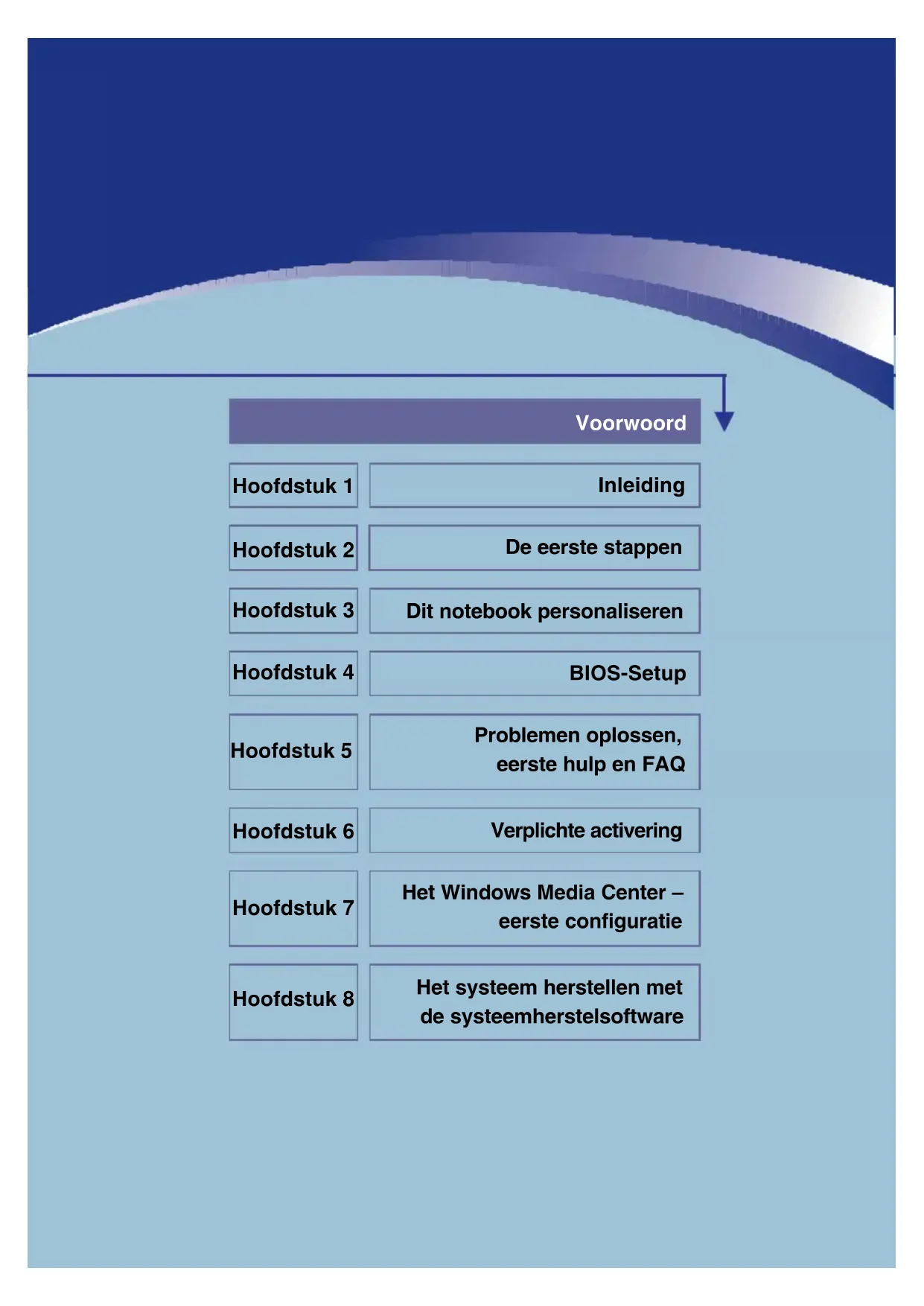 restauration terminée, cliquez sur Redémarrer l'ordinateur.8-8 NotebookVoorwoord Inleiding De eerste stappen Dit notebook personaliseren BIOS-Setup Problemen oplossen, eerste hulp en FAQ Verplichte activering Het Windows Media Center – eerste configuratie Het systeem herstellen met de systeemherstelsoftware Hoofdstuk 1 Hoofdstuk 2 Hoofdstuk 3 Hoofdstuk 4 Hoofdstuk 5 Hoofdstuk 6 Hoofdstuk 7 Hoofdstuk 8II Voorwoord Notebook Algemeen Lees voordat u het apparaat voor de eerste keer gebruikt de volgende aanwijzingen zorgvuldig door en let op alle waarschuwingen, zelfs als u vertrouwd bent met de hantering van elektronische apparaten. Bewaar dit handboek zorgvuldig, zodat u het later kunt raadplegen. Als u het apparaat verkoopt of aan iemand geeft, moet u deze handleiding beslist ook overhandigen. Gebruiksomgeving Plaats het apparaat op een vast, egaal oppervlak en zet geen voorwerpen op het apparaat. "Het apparaat is niet gebouwd voor gebruik in vertrekken met hoge temperatuur of luchtvochtigheid (bijv. badkamers) of waar bijzonder veel stof ontstaat .Bedrijfstemperatuur en bedrijfsluchtvochtigheid: 5 °C tot 35 °C, max. 85 % rel. Vochtigheid. Let op dat