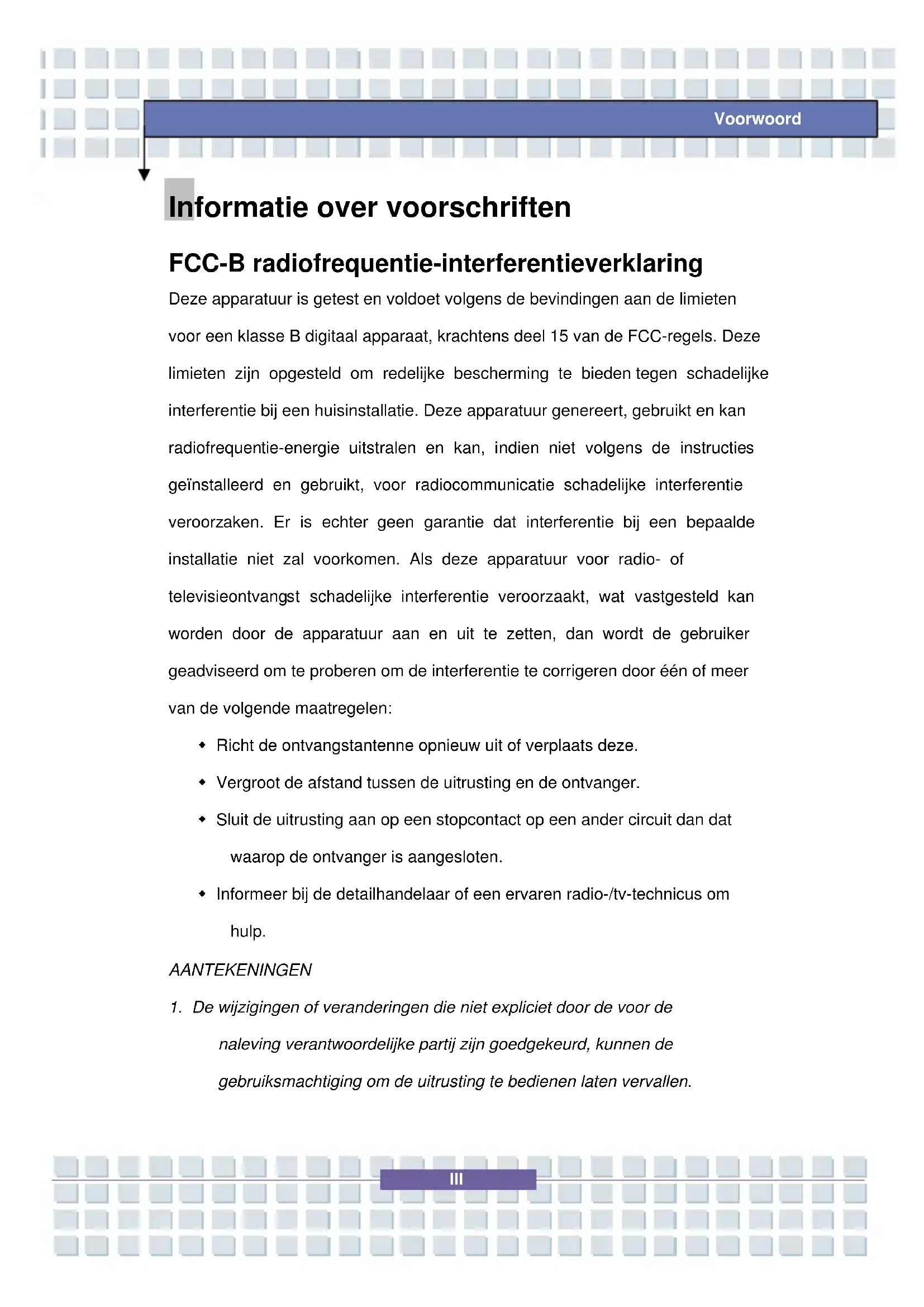 Deze apparatuur is getest en voldoet volgens de bevindingen aan de limieten voor een klasse B digitaal apparaat, krachtens deel 15 van de FCC-regels. Deze limieten zijn opgesteld om redelijke bescherming te bieden tegen schadelijke interferentie bij een huisinstallatie. Deze apparatuur genereert, gebruikt en kan radiofrequentie-energie uitstralen en kan, indien niet volgens de instructies geïnstalleerd en gebruikt, voor radiocommunicatie schadelijke interferentie veroorzaken. Er is echter geen garantie dat interferentie bij een bepaalde installatie niet zal voorkomen. Als deze apparatuur voor radio- of televisieontvangst schadelijke interferentie veroorzaakt, wat vastgesteld kan worden door de apparatuur aan en uit te zetten, dan wordt de gebruiker geadviseerd om te proberen om de interferentie te corrigeren door één of meer van de volgende maatregelen: