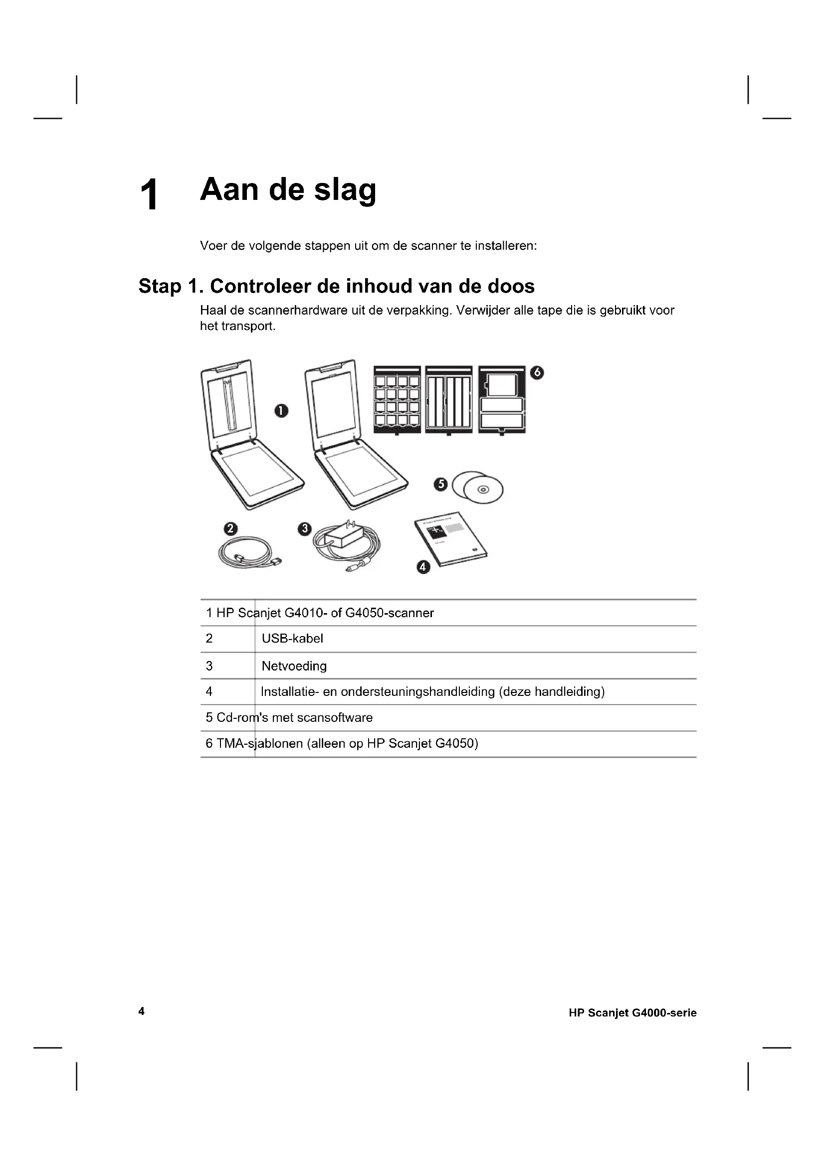 Netvoeding 4 Installatie- en ondersteuningshandleiding (deze handleiding) 5 Cd-rom's met scansoftware 6 TMA-sjablonen (alleen op HP Scanjet G4050)