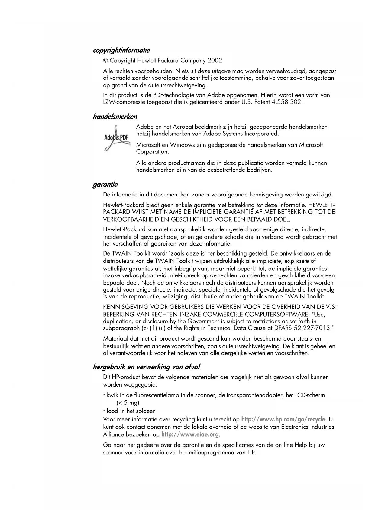 Tunisie +212 22404747 Turquie +90 216 579 7171 Ukraine +7 (380-44) 490-3520 Vénézuela 0800 4746 8368 Vietnam +84 (0)8 823 4530 usermanual.book Page 19 Wednesday, March 6, 2002 7:48 PMhp scanjet 2300c of serie 3500c gebruikershandleiding Nederlands user's manual.book Page i Wednesday, February 20, 2002 4:47 PMcopyrightinformatie © Copyright Hewlett-Packard Company 2002 Alle rechten voorbehouden. Niets uit deze uitgave mag worden verveelvoudigd, aangepast of vertaald zonder voorafgaande schriftelijke toestemming, behalve voor zover toegestaan op grond van de auteursrechtwetgeving. In dit product is de PDF-technologie van Adobe opgenomen. Hierin wordt een vorm van LZW-compressie toegepast die is gelicentieerd onder U.S. Patent 4.558.302. handelsmerken Adobe en het Acrobat-beeldmerk zijn hetzij gedeponeerde handelsmerken hetzij handelsmerken van Adobe Systems Incorporated. Microsoft en Windows zijn gedeponeerde handelsmerken van Microsoft Corporation. Alle andere productnamen die in deze publicatie worden vermeld kunnen handelsmerken zijn van de desbetreffende bedrijven. garantie De informatie in dit document kan zonder voorafgaande kennisgeving worden gewijzigd. Hewlett-Packard biedt geen enkele garantie met betrekking tot deze informatie. HEWLETT- PACKARD WIJST MET NAME DE IMPLICIETE GARANTIE AF MET BETREKKING TOT DE VERKOOPBAARHEID EN GESCHIKTHEID VOOR EEN BEPAALD DOEL. Hewlett-Packard kan niet aansprakelijk worden gesteld voor enige directe, indirecte, incidentele of gevolgschade, of enige andere schade die in verband wordt gebracht met het verschaffen of gebruiken van deze informatie. De TWAIN Toolkit wordt “zoals deze is” ter beschikking gesteld. De ontwikkelaars en de distributeurs van de TWAIN Toolkit wijzen uitdrukkelijk alle impliciete, expliciete of wettelijke garanties af, met inbegrip van, maar niet beperkt tot, de impliciete garanties inzake verkoopbaarheid, niet-inbreuk op de rechten van derden en geschiktheid voor een bepaald doel. Noch de ontwikkelaars noch de distributeurs kunnen aansprakelijk worden gesteld voor enige directe, indirecte, speciale, incidentele of gevolgschade die het gevolg is van de reproductie, wijziging, distributie of ander gebruik van de TWAIN Toolkit. KENNISGEVING VOOR GEBRUIKERS DIE WERKEN VOOR DE OVERHEID VAN DE V.S.: BEPERKING VAN RECHTEN INZAKE COMMERCIËLE COMPUTERSOFTWARE: “Use, duplication, or disclosure by the Government is subject to restrictions as set forth in subparagraph (c) (1) (ii) of the Rights in Technical Data Clause at DFARS 52.227-7013.” Materiaal dat met dit product wordt gescand kan worden beschermd door staats- en bestuurlijk recht en andere voorschriften, zoals auteursrechtwetgeving. De klant is geheel en al verantwoordelijk voor het naleven van alle dergelijke wetten en voorschriften. hergebruik en verwerking van afval Dit HP-product bevat de volgende materialen die mogelijk niet als gewoon afval kunnen worden weggegooid:
