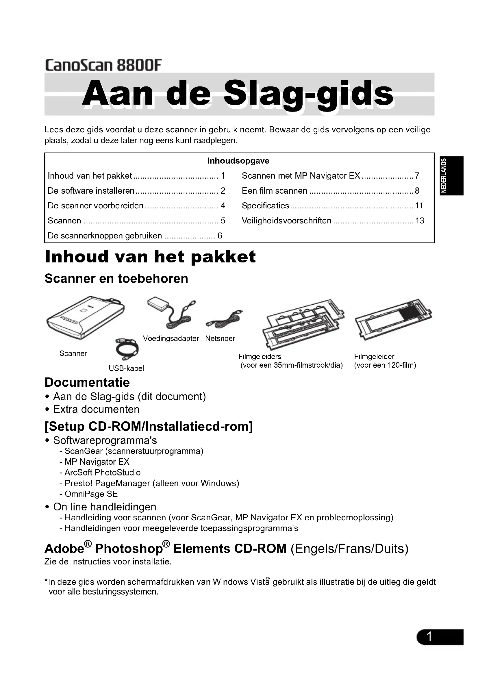 - Elements CD-ROM (Engels/Frans/Duits) Zie de instructies voor installatie.*In deze gids worden schermafdrukken van Windows Vista gebruikt als illustratie bij de uitleg die geldt voor alle besturingssystemen.Inhoudsopgave Inhoud van het pakket p. 1