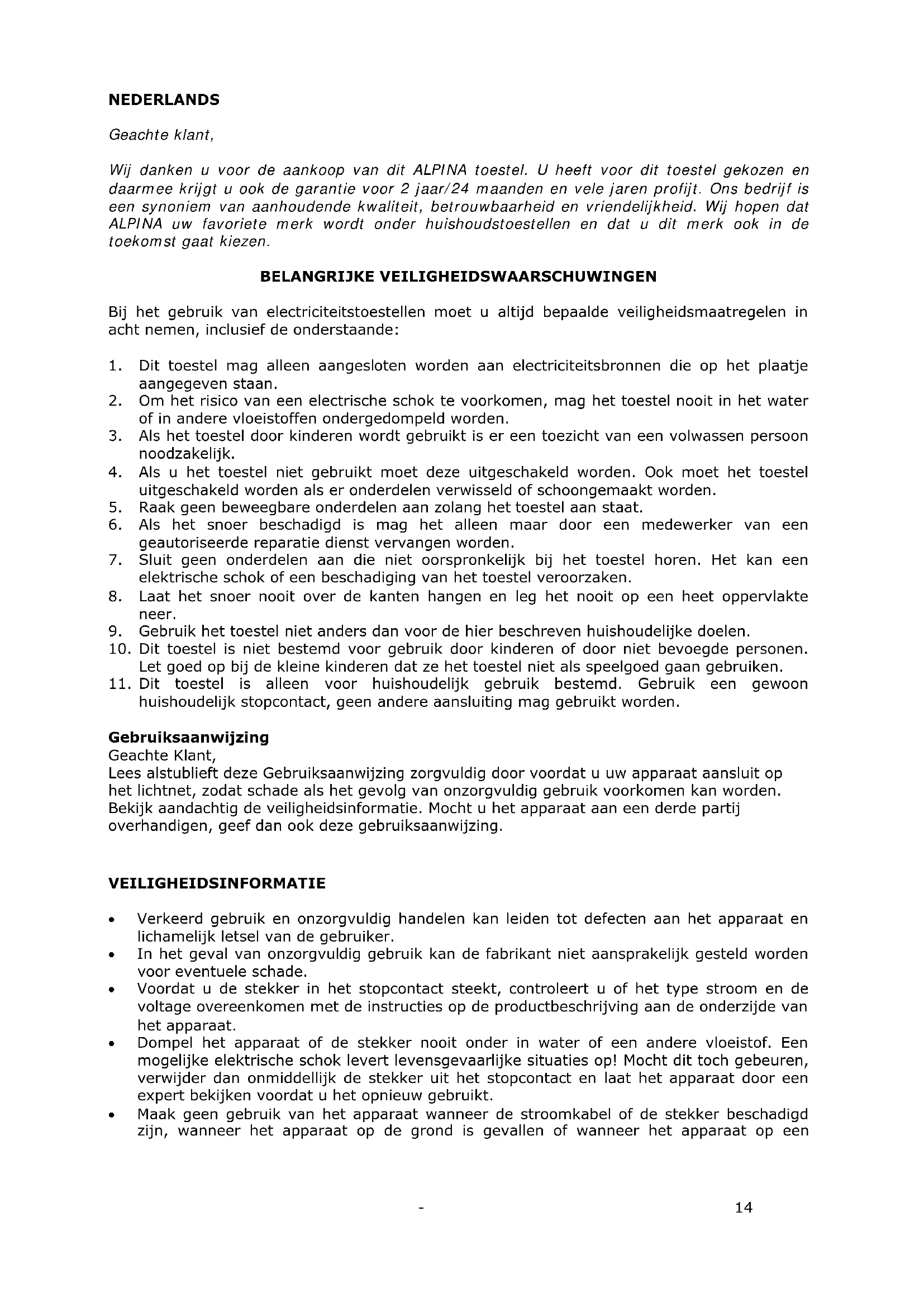 Geachte klant, Wij danken u voor de aankoop van dit ALPINA toestel. U heeft voor dit toestel gekozen en daarmee krijgt u ook de garantie voor 2 jaar/24 maanden en vele jaren profijt. Ons bedrijf is een synoniem van aanhoudende kwaliteit, betrouwbaarheid en vriendelijkheid. Wij hopen dat ALPINA uw favoriete merk wordt onder huishoudstoestellen en dat u dit merk ook in de toekomst gaat kiezen. BELANGRIJKE VEILIGHEIDSWAARSCHUWINGEN Bij het gebruik van electriciteitstoestellen moet u altijd bepaalde veiligheidsmaatregelen in acht nemen, inclusief de onderstaande: