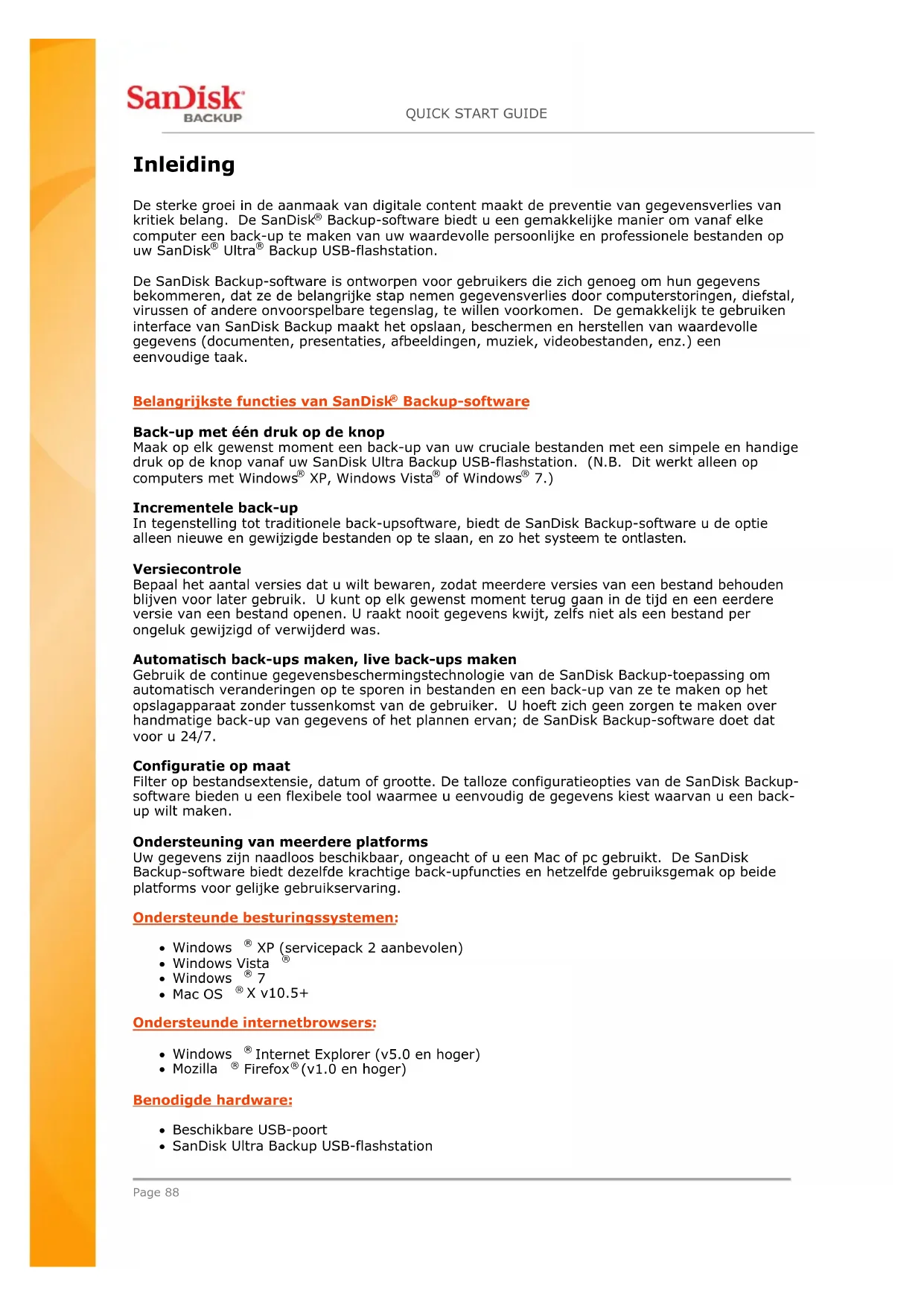 7.) Incrementele back-up In tegenstelling tot traditionele back-upsoftware, biedt de SanDisk Backup-software u de optie alleen nieuwe en gewijzigde bestanden op te slaan, en zo het systeem te ontlasten. Versiecontrole Bepaal het aantal versies dat u wilt bewaren, zodat meerdere versies van een bestand behouden blijven voor later gebruik. U kunt op elk gewenst moment terug gaan in de tijd en een eerdere versie van een bestand openen. U raakt nooit gegevens kwijt, zelfs niet als een bestand per ongeluk gewijzigd of verwijderd was. Automatisch back-ups maken, live back-ups maken Gebruik de continue gegevensbeschermingstechnologie van de SanDisk Backup-toepassing om automatisch veranderingen op te sporen in bestanden en een back-up van ze te maken op het opslagapparaat zonder tussenkomst van de gebruiker. U hoeft zich geen zorgen te maken over handmatige back-up van gegevens of het plannen ervan; de SanDisk Backup-software doet dat voor u 24/7. Configuratie op maat Filter op bestandsextensie, datum of grootte. De talloze configuratieopties van de SanDisk Backup- software bieden u een flexibele tool waarmee u eenvoudig de gegevens kiest waarvan u een back- up wilt maken. Ondersteuning van meerdere platforms Uw gegevens zijn naadloos beschikbaar, ongeacht of u een Mac of pc gebruikt. De SanDisk Backup-software biedt dezelfde krachtige back-upfuncties en hetzelfde gebruiksgemak op beide platforms voor gelijke gebruikservaring. Ondersteunde besturingssystemen: Windows