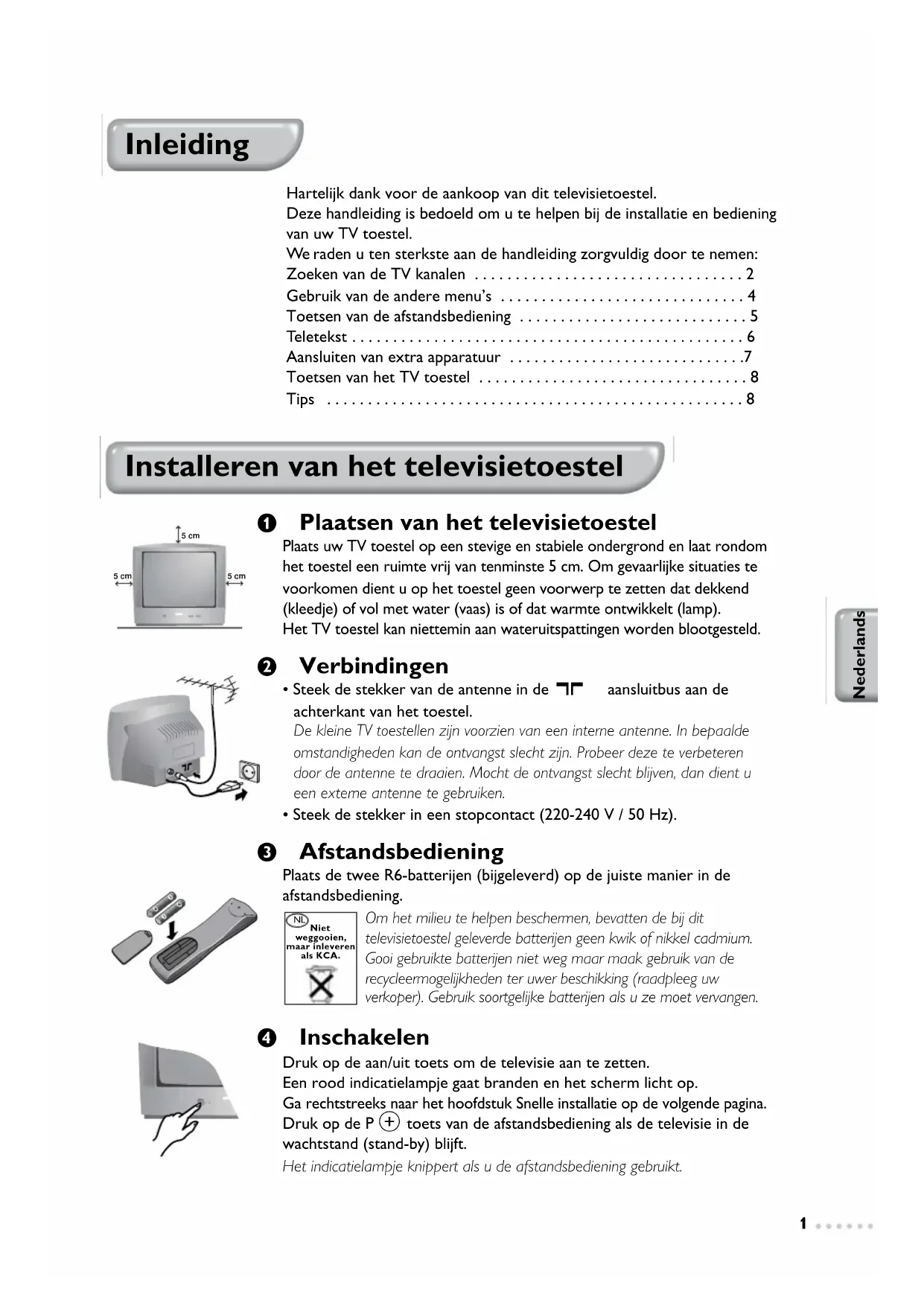 - Tips æ Plaatsen van het televisietoestel Plaats uw TV toestel op een stevige en stabiele ondergrond en laat rondom het toestel een ruimte vrij van tenminste 5 cm. Om gevaarlijke situaties te voorkomen dient u op het toestel geen voorwerp te zetten dat dekkend (kleedje) of vol met water (vaas) is of dat warmte ontwikkelt (lamp). Het TV toestel kan niettemin aan wateruitspattingen worden blootgesteld. Â Verbindingen p. 8