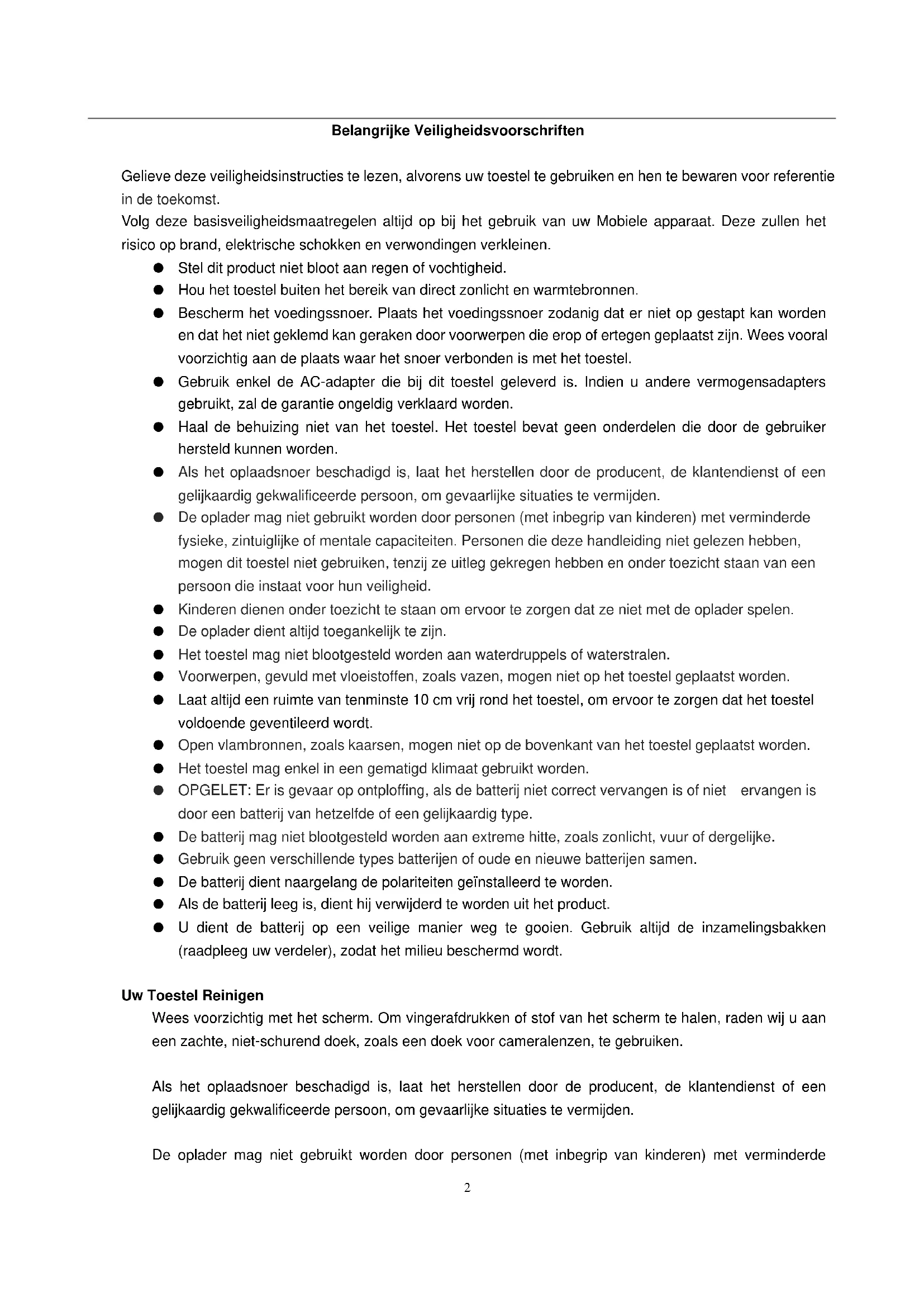 - De oplader mag niet gebruikt worden door personen (met inbegrip van kinderen) met verminderde fysieke, zintuiglijke of mentale capaciteiten. Personen die deze handleiding niet gelezen hebben, mogen dit toestel niet gebruiken, tenzij ze uitleg gekregen hebben en onder toezicht staan van een persoon die instaat voor hun veiligheid.