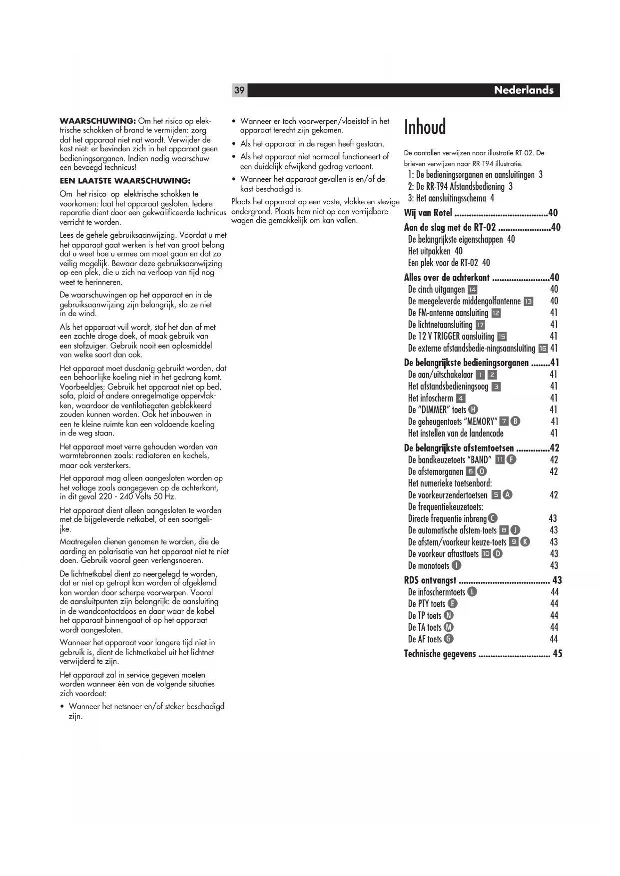 EXTRA INFORMATIE: De RDS functie is geheel afhankelijk van het feit of een zender wavel RDS data uitzendt. Dus kunt u RDS informatie alleen maar ontvangen waar de zenders voorzijen zijn van RDS apparatuur. Ontvangt u geen RDS informatie dan gedraagt de RT-02 zich als een normale tuner.