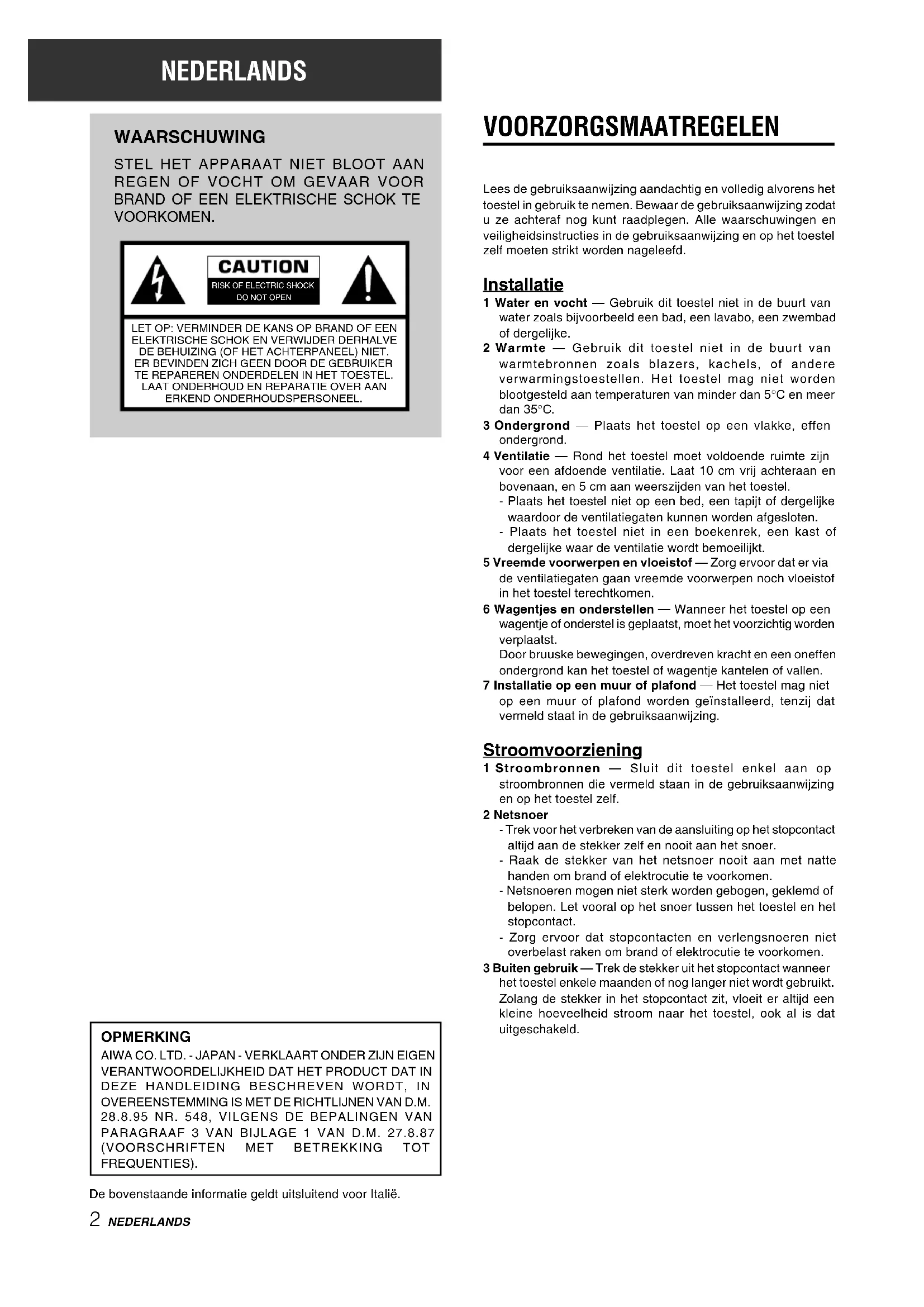 VOORKOMEN. VOORZORGSMAATREGELEN Lees de gebruiksaanwijzing aandachtig en volledig alvorens het toestel in gebruik te nemen. Bewaar de gebruiksaanwijzing zodat u ze achteraf nog kunt raadplegen. Alle waarschuwingen en veiligheidsinstructies in de gebruiksaanwijzing en op het toestel zelf moeten strikt worden nageleefd. Installatie 1 Water en vocht — Gebruik dit toestel niet in de buurt van water zoals bijvoorbeeld een bad, een lavabo, een zwembad of dergelijke. 2 Warmte — Gebruik dit toestel niet in de buurt van warmtebronnen zoals blazers, kachels, of andere verwarmingstoestellen. Het toestel mag niet worden blootgesteld aan temperaturen van minder dan 5°C en meer dan 35°C. 3 Ondergrond — Plaats het toestel op een vlakke, effen ondergrond. 4 Ventilatie — Rond het toestel moet voldoende ruimte zijn voor een afdoende ventilatie. Laat 10 cm vrij achteraan en bovenaan, en 5 cm aan weerszijden van het toestel. - Plaats het toestel niet op een bed, een tapijt of dergelijke waardoor de ventilatiegaten kunnen worden afgesloten. - Plaats het toestel niet in een boekenrek, een kast of dergelijke waar de ventilatie wordt bemoeilijkt. 5 Vreemde voorwerpen en vloeistof — Zorg ervoor dat er via de ventilatiegaten gaan vreemde voorwerpen noch vloeistof in het toestel terechtkomen. 6 Wagentjes en onderstellen — Wanneer het toestel op een wagentje of onderstel is geplaatst, moet het voorzichtig worden verplaatst. Door bruuske bewegingen, overdreven kracht en een oneffen ondergrond kan het toestel of wagentje kantelen of vallen. 7 Installatie op een muur of plafond — Het toestel mag niet op een muur of plafond worden geïnstalleerd, tenzij dat vermeld staat in de gebruiksaanwijzing. Stroomvoorziening 1 Stroombronnen — Sluit dit toestel enkel aan op stroombronnen die vermeld staan in de gebruiksaanwijzing en op het toestel zelf. 2 Netsnoer - Trek voor het verbreken van de aansluiting op het stopcontact altijd aan de stekker zelf en nooit aan het snoer. - Raak de stekker van het netsnoer nooit aan met natte handen om brand of elektrocutie te voorkomen. - Netsnoeren mogen niet sterk worden gebogen, geklemd of belopen. Let vooral op het snoer tussen het toestel en het stopcontact. - Zorg ervoor dat stopcontacten en verlengsnoeren niet overbelast raken om brand of elektrocutie te voorkomen. 3 Buiten gebruik — Trek de stekker uit het stopcontact wanneer het toestel enkele maanden of nog langer niet wordt gebruikt. Zolang de stekker in het stopcontact zit, vloeit er altijd een kleine hoeveelheid stroom naar het toestel, ook al is dat uitgeschakeld. OPMERKING AIWA CO. LTD. - JAPAN - VERKLAART ONDER ZIJN EIGEN