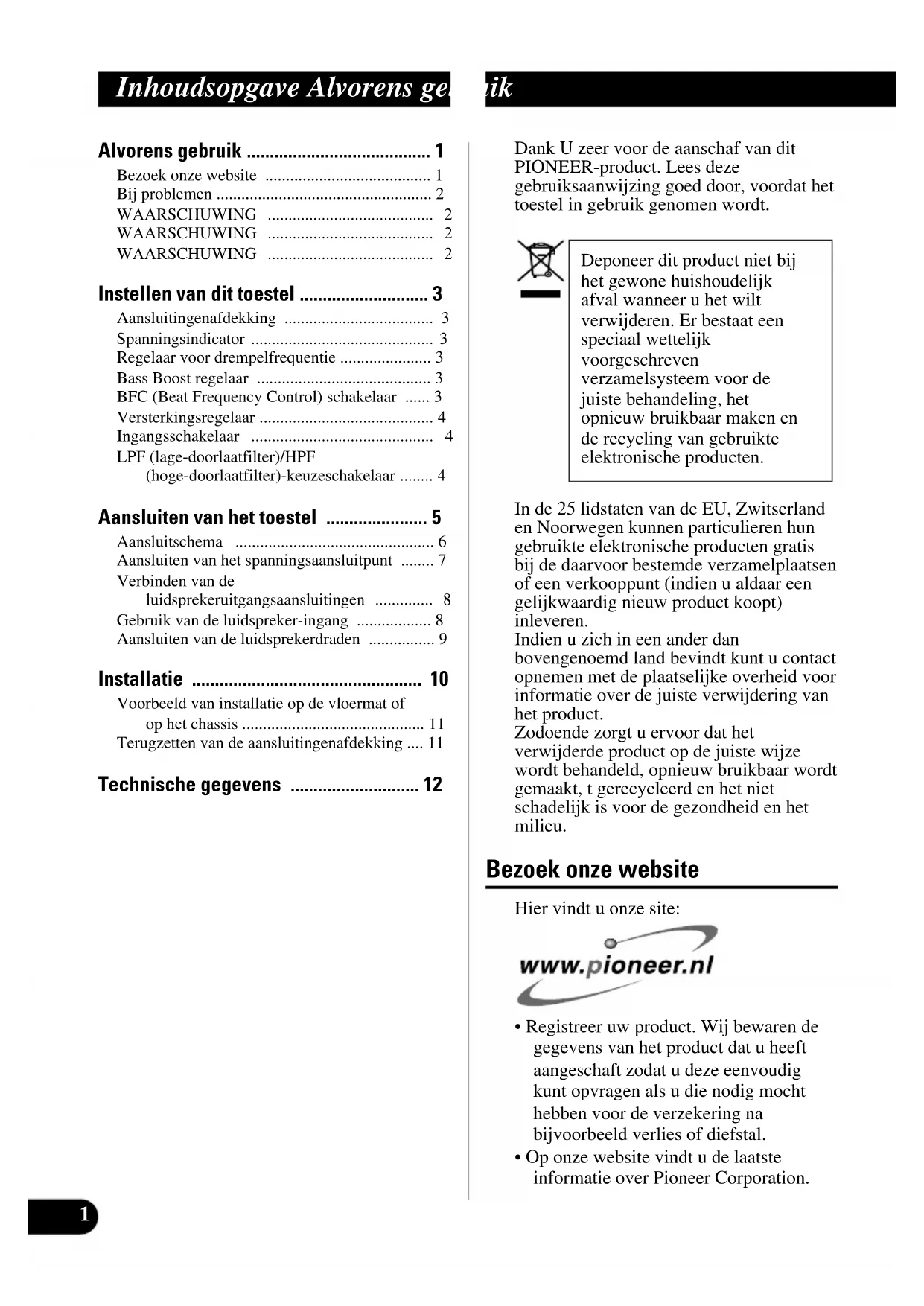 - Technische gegevens Dank U zeer voor de aanschaf van dit PIONEER-product. Lees deze gebruiksaanwijzing goed door, voordat het toestel in gebruik genomen wordt. In de 25 lidstaten van de EU, Zwitserland en Noorwegen kunnen particulieren hun gebruikte elektronische producten gratis bij de daarvoor bestemde verzamelplaatsen of een verkooppunt (indien u aldaar een gelijkwaardig nieuw product koopt) inleveren. Indien u zich in een ander dan bovengenoemd land bevindt kunt u contact opnemen met de plaatselijke overheid voor informatie over de juiste verwijdering van het product. Zodoende zorgt u ervoor dat het verwijderde product op de juiste wijze wordt behandeld, opnieuw bruikbaar wordt gemaakt, t gerecycleerd en het niet schadelijk is voor de gezondheid en het milieu. Bezoek onze website Hier vindt u onze site: p. 12