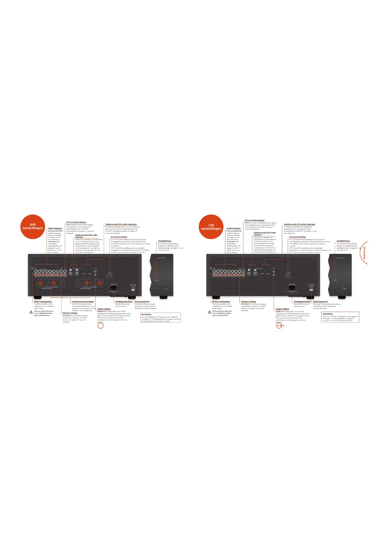 PHONES POWER POWER / STANDBY Spanningselectie Controleer of de geselecteerde spanning overeenkomt met uw plaatselijke stroomvoorziening. Voedingaansluiting Sluit hier het correcte netsnoer op aan. Opname-uitgang RECORD OUT is een lijnniveau uitgang voor gebruik in opname van andere bronnen. Zie pagina 11 voor meer informatie. Trigger-uitgang TRIGGER OUT wordt gebruikt om de C49 de vermogenstatus van alle aangesloten apparatuur te regelen, zoals een P49/P349 vermogensversterker. Het is voor normaal gebruik niet nodig aansluitingen op deze uitgangen tot stand te brengen. Hoofdtelefoons 3,5 mm stereo busaansluiting, bedoeld voor gebruik met een hoofdtelefoonset. Zie pagina 11 voor meer informatie. Phono aardingsklem Voor het aansluiten van de aardedraad van uw draaitafel, indien nodig. Merk op dat deze klem niet als een veiligheidsaarding mag worden gebruikt. Voorversterkeruitgang PRE OUT verstrekt een ongebalanceerde uitgang voor aansluiting op een vermogensversterker (bijvoorbeeld een P49/P349). Zie pagina 11 voor meer informatie. Audio-ingangen AUX, Tuner, SAT, BD, PVR en AV zijn allemaal lijnniveau ingangen. Zie pagina 10 voor meer informatie. PHONO (MM) hee verschillende karakteristieken. Zie pagina 21 voor de specicaties van de phono-ingang. Gebalanceerde XLR-audio-uitgangen Verstrekt een gebalanceerde uitgang voor aansluiting op een vermogensversterker (bijvoorbeeld een P49/P349). Zie pagina 11 voor meer informatie. Gebalanceerde XLR-audio- ingangen Gebruik deze ingangen voor aansluiting van uw bronapparaat als deze bron gebalanceerde XLR-uitgangen hee. Gebruik echter de phono-ingangen als uw bronapparaat is voorzien van ongebalanceerde uitgangen. Zie voor meer informatie pagina10. Accessoirevoeding 6V 3,5 mm mono busaansluiting voor de accessoire voedingskabel (meegeleverd). Deze kabel biedt twee 2,1mm DC-stekkers om 6V r serie accessoires van stroom te voorzien. 12V 2,5mm DC-aansluiting voor accessoirekabel (inbegrepen). Deze kabel biedt twee 2,5mm DC-stekkers om 12V r serie accessoires van stroom te voorzien.Nederlands N-9N-8 P49 aansluitingen Opmerking Lees a.u.b. de secties ‘Het plaatsen van het apparaat’, ‘Voeding’ en ‘Verbindingskabels’ op pagina 5 voordat u uw P49 vermogensversterker aansluit!