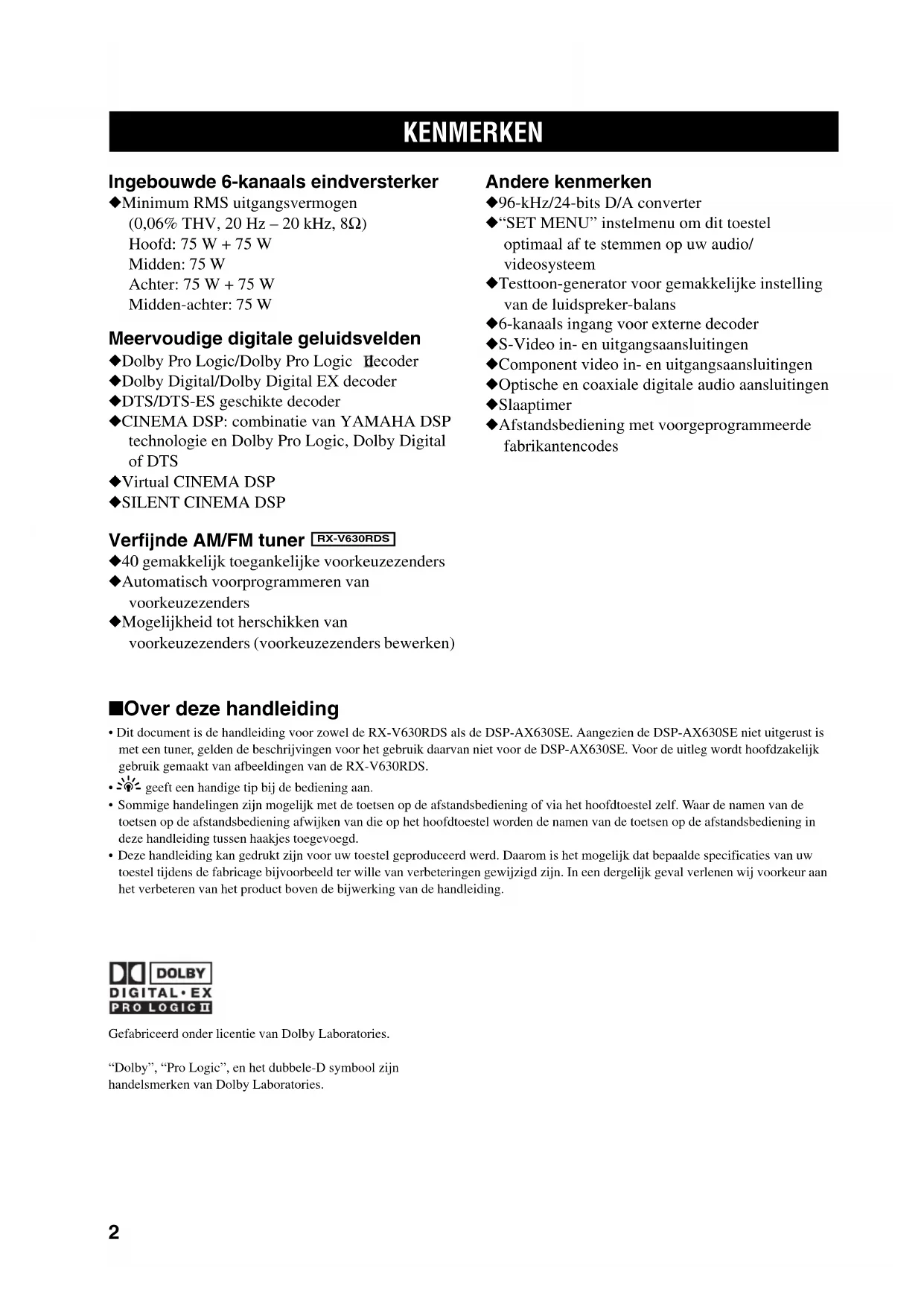 Verfijnde AM/FM tuner RX-V630RDS ◆ 40 gemakkelijk toegankelijke voorkeuzezenders ◆ Automatisch voorprogrammeren van voorkeuzezenders ◆ Mogelijkheid tot herschikken van voorkeuzezenders (voorkeuzezenders bewerken) Andere kenmerken ◆ 96-kHz/24-bits D/A converter ◆ “SET MENU” instelmenu om dit toestel optimaal af te stemmen op uw audio/ videosysteem ◆ Testtoon-generator voor gemakkelijke instelling van de luidspreker-balans ◆ 6-kanaals ingang voor externe decoder ◆ S-Video in- en uitgangsaansluitingen ◆ Component video in- en uitgangsaansluitingen ◆ Optische en coaxiale digitale audio aansluitingen ◆ Slaaptimer ◆ Afstandsbediening met voorgeprogrammeerde fabrikantencodes ■ Over deze handleiding