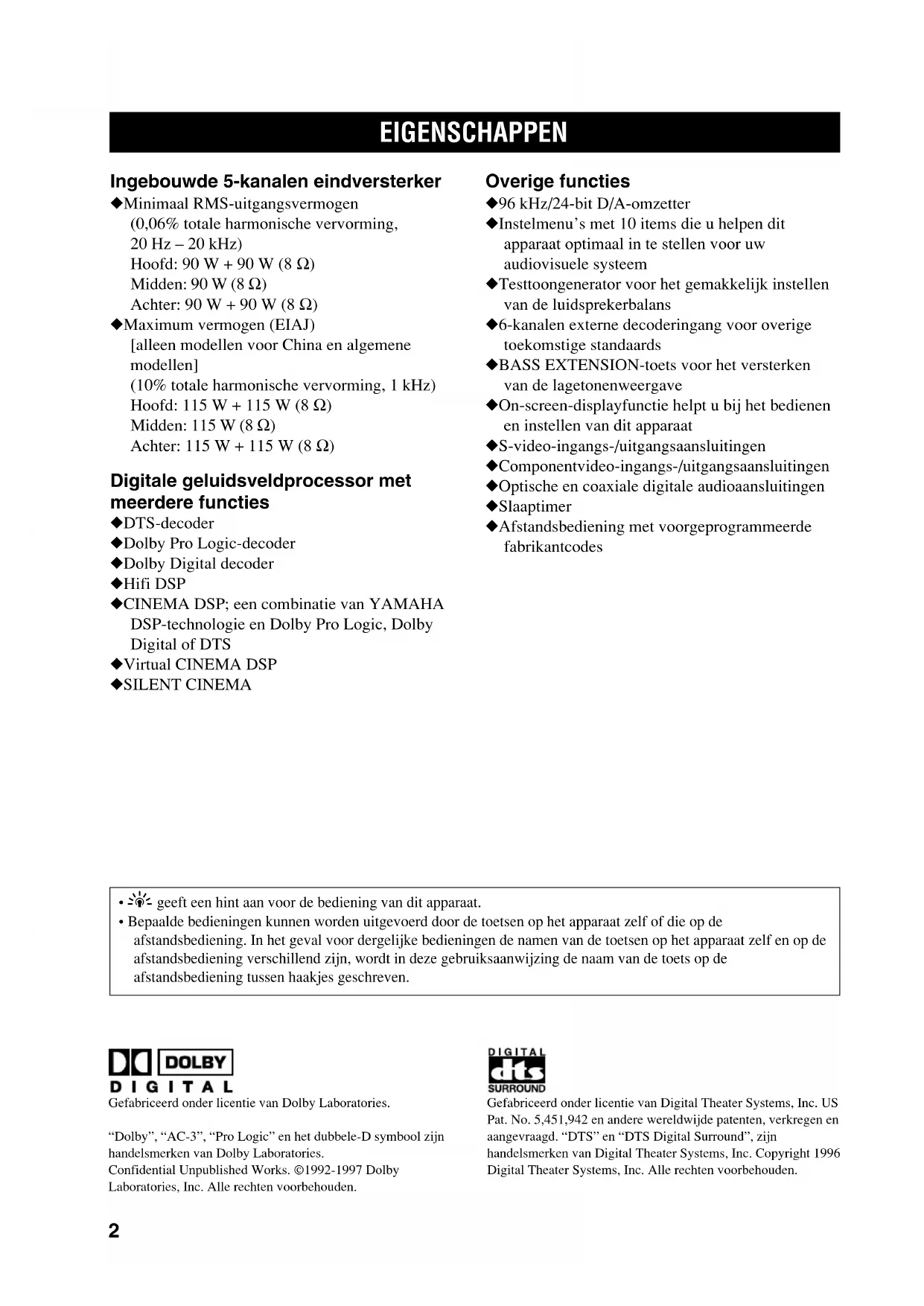 - INDEX 0702AX620(GB)_1-10_NL 1/24/1, 1:29 PM12 Ingebouwde 5-kanalen eindversterker ◆ Minimaal RMS-uitgangsvermogen (0,06% totale harmonische vervorming, 20 Hz – 20 kHz) Hoofd: 90 W + 90 W (8 Ω) Midden: 90 W (8 Ω) Achter: 90 W + 90 W (8 Ω) ◆ Maximum vermogen (EIAJ) [alleen modellen voor China en algemene modellen] (10% totale harmonische vervorming, 1 kHz) Hoofd: 115 W + 115 W (8 Ω) Midden: 115 W (8 Ω) Achter: 115 W + 115 W (8 Ω) Digitale geluidsveldprocessor met meerdere functies ◆ DTS-decoder ◆ Dolby Pro Logic-decoder ◆ Dolby Digital decoder ◆ Hifi DSP ◆ CINEMA DSP; een combinatie van YAMAHA DSP-technologie en Dolby Pro Logic, Dolby Digital of DTS ◆ Virtual CINEMA DSP ◆ SILENT CINEMA Overige functies ◆ 96 kHz/24-bit D/A-omzetter ◆ Instelmenu’s met 10 items die u helpen dit apparaat optimaal in te stellen voor uw audiovisuele systeem ◆ Testtoongenerator voor het gemakkelijk instellen van de luidsprekerbalans ◆ 6-kanalen externe decoderingang voor overige toekomstige standaards ◆ BASS EXTENSION-toets voor het versterken van de lagetonenweergave ◆ On-screen-displayfunctie helpt u bij het bedienen en instellen van dit apparaat ◆ S-video-ingangs-/uitgangsaansluitingen ◆ Componentvideo-ingangs-/uitgangsaansluitingen ◆ Optische en coaxiale digitale audioaansluitingen ◆ Slaaptimer ◆ Afstandsbediening met voorgeprogrammeerde fabrikantcodes EIGENSCHAPPEN Gefabriceerd onder licentie van Dolby Laboratories.“Dolby”, “AC-3”, “Pro Logic” en het dubbele-D symbool zijnhandelsmerken van Dolby Laboratories.Confidential Unpublished Works. ©1992-1997 DolbyLaboratories, Inc. Alle rechten voorbehouden.Gefabriceerd onder licentie van Digital Theater Systems, Inc. USPat. No. 5,451,942 en andere wereldwijde patenten, verkregen enaangevraagd. “DTS” en “DTS Digital Surround”, zijnhandelsmerken van Digital Theater Systems, Inc. Copyright 1996Digital Theater Systems, Inc. Alle rechten voorbehouden. p. 62