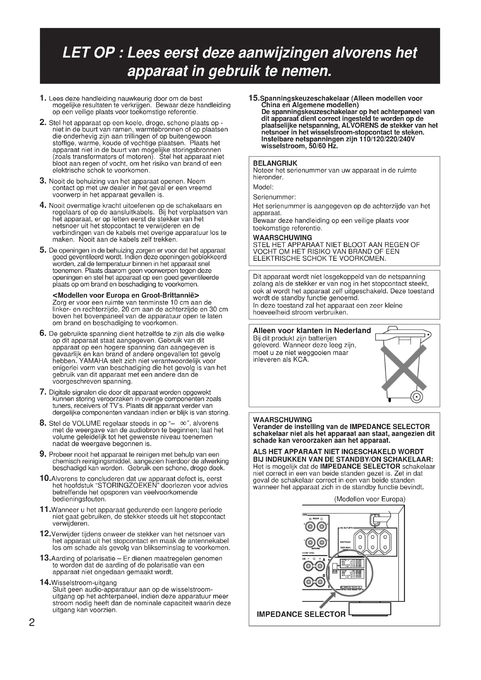 chemisch reinigingsmiddel, aangezien hierdoor de afwerking beschadigd kan worden. Gebruik een schone, droge doek. 10.Alvorens te concluderen dat uw apparaat defect is, eerst het hoofdstuk “STORINGZOEKEN” doorlezen voor advies betreffende het opsporen van veelvoorkomende bedieningsfouten. 11.Wanneer u het apparaat gedurende een langere periode niet gaat gebruiken, de stekker steeds uit het stopcontact verwijderen. 12.Verwijder tijdens onweer de stekker van het netsnoer van het apparaat uit het stopcontact en maak de antennekabel los om schade als gevolg van blikseminslag te voorkomen. 13.Aarding of polarisatie – Er dienen maatregelen genomen te worden dat de aarding of de polarisatie van een apparaat niet ongedaan gemaakt wordt. 14.Wisselstroom-uitgang Sluit geen audio-apparatuur aan op de wisselstroom- uitgang op het achterpaneel, indien deze apparatuur meer stroom nodig heeft dan de nominale capaciteit waarin deze uitgang kan voorzien. 15.Spanningskeuzeschakelaar (Alleen modellen voor China en Algemene modellen) De spanningskeuzeschakelaar op het achterpaneel van dit apparaat dient correct ingesteld te worden op de plaatselijke netspanning, ALVORENS de stekker van het netsnoer in het wisselstroom-stopcontact te steken. Instelbare netspanningen zijn 110/120/220/240V wisselstroom, 50/60 Hz. BELANGRIJK Noteer het serienummer van uw apparaat in de ruimte hieronder. Model: Serienummer: Het serienummer is aangegeven op de achterzijde van het apparaat. Bewaar deze handleiding op een veilige plaats voor toekomstige referentie. WAARSCHUWING STEL HET APPARAAT NIET BLOOT AAN REGEN OF VOCHT OM HET RISIKO VAN BRAND OF EEN ELEKTRISCHE SCHOK TE VOORKOMEN. Dit apparaat wordt niet losgekoppeld van de netspanning zolang als de stekker er van nog in het stopcontact steekt, ook al wordt het apparaat zelf uitgeschakeld. Deze toestand wordt de standby functie genoemd. In deze toestand zal het apparaat een zeer kleine hoeveelheid stroom verbruiken. Alleen voor klanten in Nederland Bij dit produkt zijn batterijen geleverd. Wanneer deze leeg zijn, moet u ze niet weggooien maar inleveren als KCA. WAARSCHUWING Verander de instelling van de IMPEDANCE SELECTOR schakelaar niet als het apparaat aan staat, aangezien dit schade kan veroorzaken aan het apparaat.