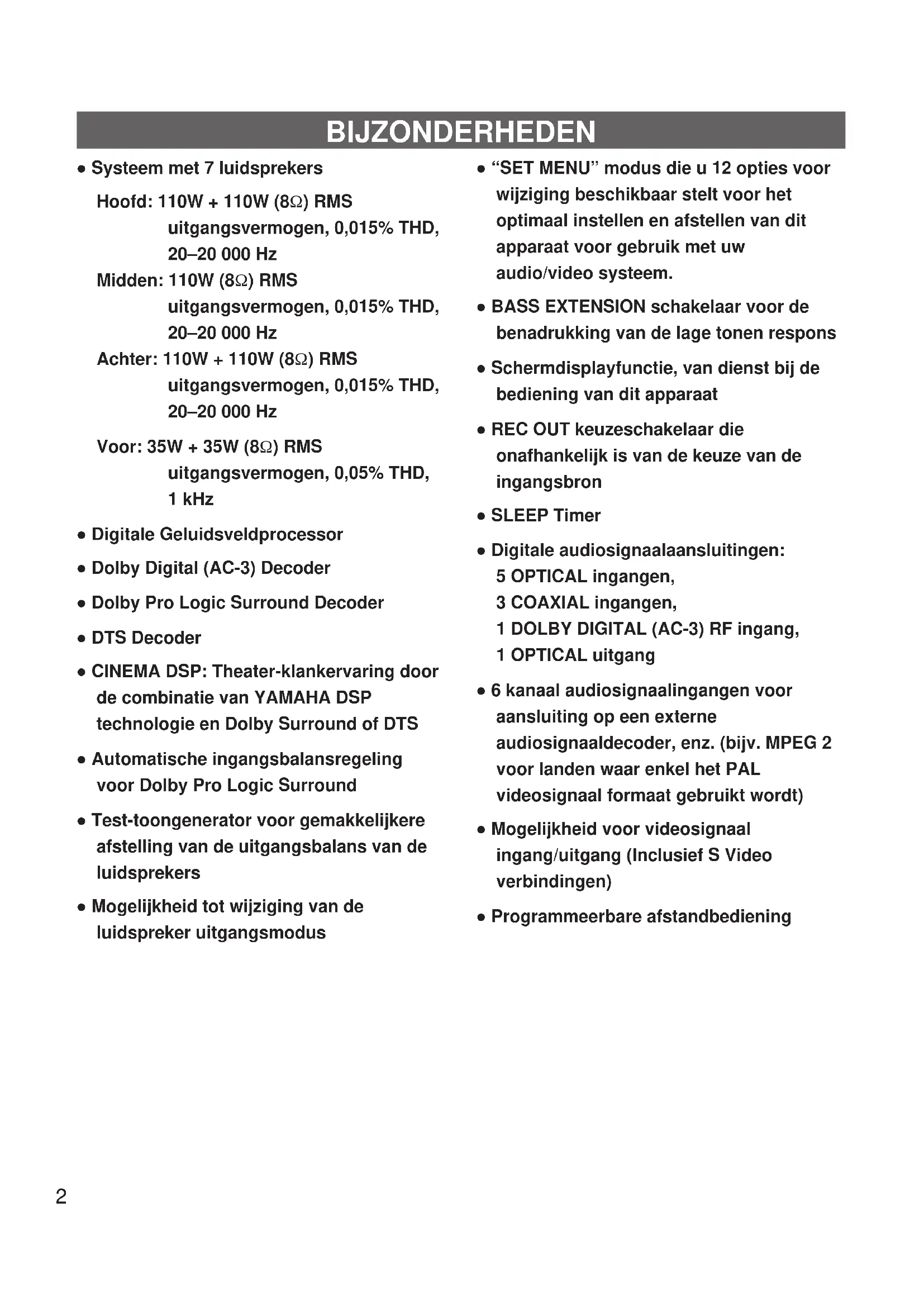 STORINGZOEKEN ........................................................... 73 SPECIFICATIES ................................................................ 762 ● Systeem met 7 luidsprekers Hoofd: 110W + 110W (8Ω) RMS uitgangsvermogen, 0,015% THD, 20–20 000 Hz Midden: 110W (8Ω) RMS uitgangsvermogen, 0,015% THD, 20–20 000 Hz Achter: 110W + 110W (8Ω) RMS uitgangsvermogen, 0,015% THD, 20–20 000 Hz Voor: 35W + 35W (8Ω) RMS uitgangsvermogen, 0,05% THD, 1 kHz ● Digitale Geluidsveldprocessor ● Dolby Digital (AC-3) Decoder ● Dolby Pro Logic Surround Decoder ● DTS Decoder ● CINEMA DSP: Theater-klankervaring door de combinatie van YAMAHA DSP technologie en Dolby Surround of DTS ● Automatische ingangsbalansregeling voor Dolby Pro Logic Surround ● Test-toongenerator voor gemakkelijkere afstelling van de uitgangsbalans van de luidsprekers ● Mogelijkheid tot wijziging van de luidspreker uitgangsmodus ● “SET MENU” modus die u 12 opties voor wijziging beschikbaar stelt voor het optimaal instellen en afstellen van dit apparaat voor gebruik met uw audio/video systeem. ● BASS EXTENSION schakelaar voor de benadrukking van de lage tonen respons ● Schermdisplayfunctie, van dienst bij de bediening van dit apparaat ● REC OUT keuzeschakelaar die onafhankelijk is van de keuze van de ingangsbron ● SLEEP Timer ● Digitale audiosignaalaansluitingen: 5 OPTICAL ingangen, 3 COAXIAL ingangen, 1 DOLBY DIGITAL (AC-3) RF ingang, 1 OPTICAL uitgang ● 6 kanaal audiosignaalingangen voor aansluiting op een externe audiosignaaldecoder, enz. (bijv. MPEG 2 voor landen waar enkel het PAL videosignaal formaat gebruikt wordt) ● Mogelijkheid voor videosignaal ingang/uitgang (Inclusief S Video verbindingen) ● Programmeerbare afstandbediening BIJZONDERHEDEN3 Nederlands