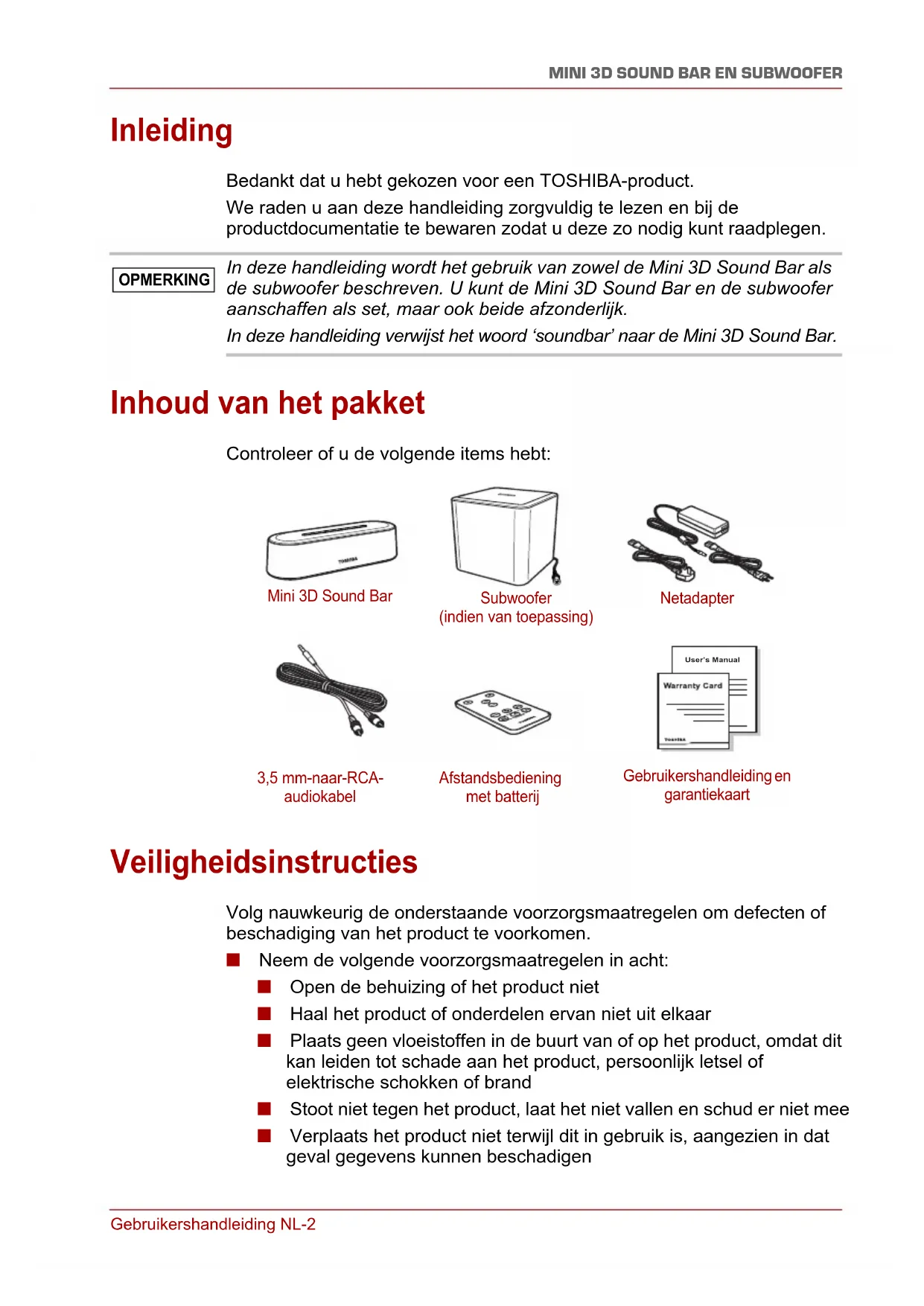 Inleiding Bedankt dat u hebt gekozen voor een TOSHIBA-product. We raden u aan deze handleiding zorgvuldig te lezen en bij de productdocumentatie te bewaren zodat u deze zo nodig kunt raadplegen. Inhoud van het pakket Controleer of u de volgende items hebt: Veiligheidsinstructies Volg nauwkeurig de onderstaande voorzorgsmaatregelen om defecten of beschadiging van het product te voorkomen. ■ Neem de volgende voorzorgsmaatregelen in acht: ■ Open de behuizing of het product niet ■ Haal het product of onderdelen ervan niet uit elkaar ■ Plaats geen vloeistoffen in de buurt van of op het product, omdat dit kan leiden tot schade aan het product, persoonlijk letsel of elektrische schokken of brand ■ Stoot niet tegen het product, laat het niet vallen en schud er niet mee ■ Verplaats het product niet terwijl dit in gebruik is, aangezien in dat geval gegevens kunnen beschadigen In deze handleiding wordt het gebruik van zowel de Mini 3D Sound Bar als de subwoofer beschreven. U kunt de Mini 3D Sound Bar en de subwoofer aanschaffen als set, maar ook beide afzonderlijk. In deze handleiding verwijst het woord ‘soundbar’ naar de Mini 3D Sound Bar. OPMERKING User’s Manual Mini 3D Sound Bar Subwoofer (indien van toepassing) Netadapter 3,5 mm-naar-RCA- audiokabel Afstandsbediening met batterij Gebruikershandleiding en garantiekaartNL-3 Gebruikershandleiding