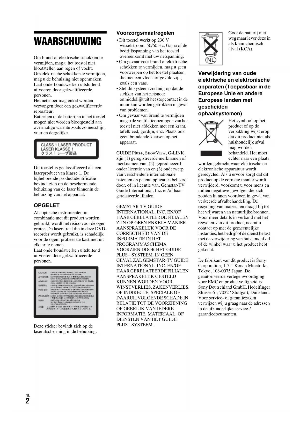 GUIDE Plus+, SHOWVIEW, G-LINK zijn (1) geregistreerde merknamen of merknamen van, (2) geproduceerd onder licentie van en (3) onderwerp van verscheidene internationale patenten en patentapplicaties beheerd door, of in licentie van, Gemstar-TV Guide International, Inc. en/of haar gerelateerde filialen.