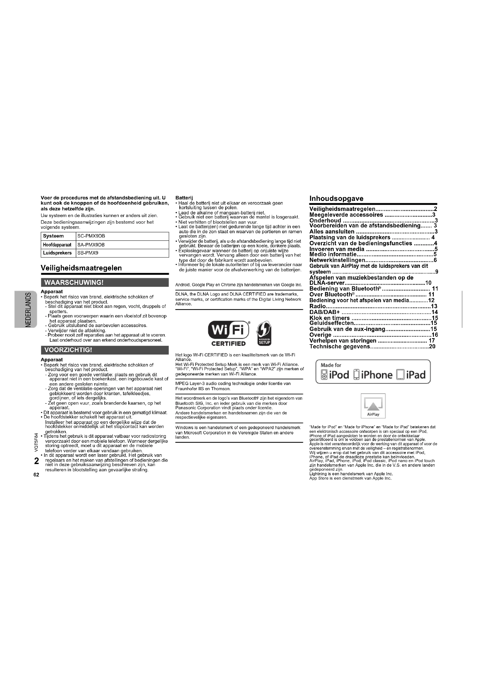 - Technische gegevens “Made for iPod” en “Made for iPhone” en “Made for iPad” betekenen dat een elektronisch accessoire ontworpen is om speciaal op een iPod, iPhone of iPad aangesloten te worden en door de ontwikkelaar gecertificeerd is om te voldoen aan de prestatienormen van Apple.Apple is niet verantwoordelijk voor de werking van dit apparaat of voor de overeenstemming ervan met de veiligheid – en registratienormen.Wij wijzen u erop dat het gebruik van dit accessoire met iPod, iPhone, of iPad de draadloze prestatie kan beïnvloeden.AirPlay, iPad, iPhone, iPod, iPod classic, iPod nano en iPod touch zijn handelsmerken van Apple Inc. die in de V.S. en andere landen gedeponeerd zijn.Lightning is een handelsmerk van Apple Inc.App Store is een dienstmerk van Apple Inc. Systeem SC-PMX9DB Hoofdapparaat SA-PMX9DB Luidsprekers SB-PMX9 WAARSCHUWING! VOORZICHTIG! p. 20