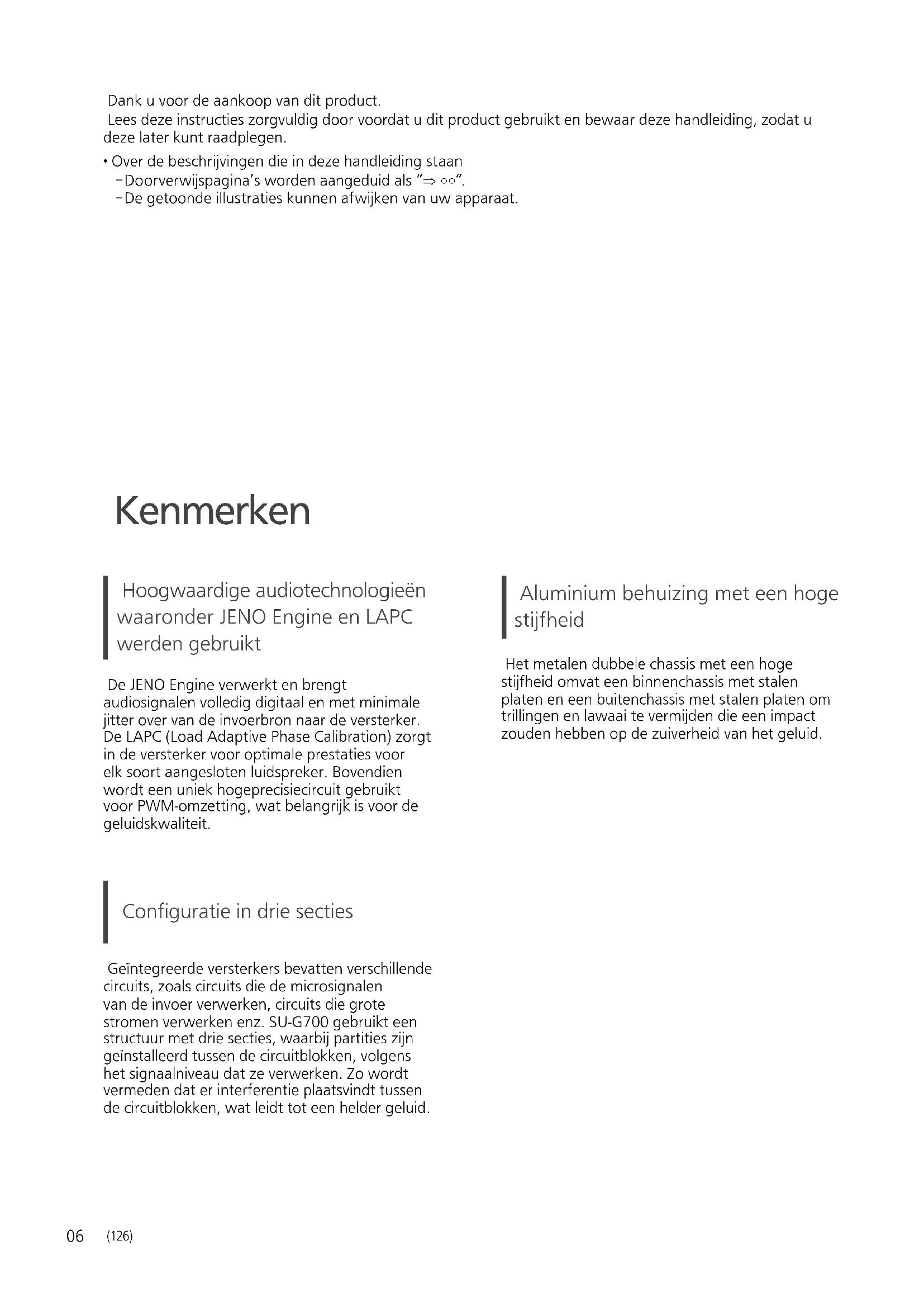 - Over de beschrijvingen die in deze handleiding staan - Doorverwijspagina’s worden aangeduid als “ ○○”. - De getoonde illustraties kunnen afwijken van uw apparaat. Hoogwaardige audiotechnologieën waaronder JENO Engine en LAPC werden gebruikt De JENO Engine verwerkt en brengt audiosignalen volledig digitaal en met minimale jitter over van de invoerbron naar de versterker. De LAPC (Load Adaptive Phase Calibration) zorgt in de versterker voor optimale prestaties voor elk soort aangesloten luidspreker. Bovendien wordt een uniek hogeprecisiecircuit gebruikt voor PWM-omzetting, wat belangrijk is voor de geluidskwaliteit. Configuratie in drie secties Geïntegreerde versterkers bevatten verschillende circuits, zoals circuits die de microsignalen van de invoer verwerken, circuits die grote stromen verwerken enz. SU-G700 gebruikt een structuur met drie secties, waarbij partities zijn geïnstalleerd tussen de circuitblokken, volgens het signaalniveau dat ze verwerken. Zo wordt vermeden dat er interferentie plaatsvindt tussen de circuitblokken, wat leidt tot een helder geluid. Aluminium behuizing met een hoge stijfheid Het metalen dubbele chassis met een hoge stijfheid omvat een binnenchassis met stalen platen en een buitenchassis met stalen platen om trillingen en lawaai te vermijden die een impact zouden hebben op de zuiverheid van het geluid. KenmerkenNederlands