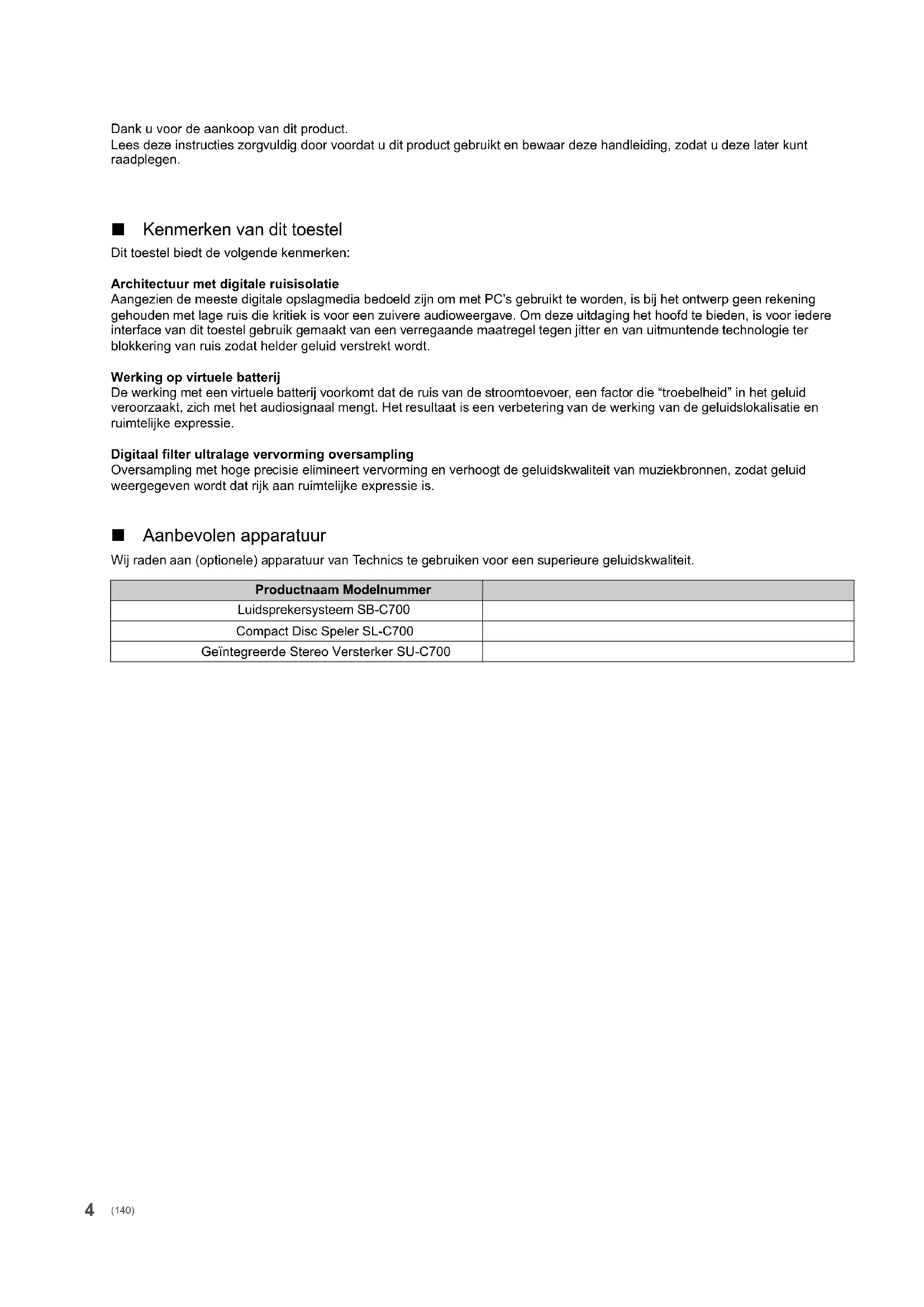 DAMAGES (INCLUDING, BUT NOT LIMITED TO, PROCUREMENT OF SUBSTITUTE GOODS OR SERVICES; LOSS OF USE, DATA, OR PROFITS; OR BUSINESS INTERRUPTION) HOWEVER CAUSED AND ON ANY THEORY OF LIABILITY, WHETHER IN CONTRACT, STRICT LIABILITY, OR TORT (INCLUDING NEGLIGENCE OR OTHERWISE) ARISING IN ANY WAY OUT OF THE USE OF THIS SOFTWARE, EVEN IF ADVISED OF THE POSSIBILITY OF SUCH DAMAGE. Il software Spotify è soggetto a licenze di terzi che è possibile trovare qui: www.spotify.com/connect/third-party-licenses (138) ST-C700DE-TQBM0007.book 36 ページ 2016年10月26日 水曜日 午後1時17分37 Italiano (139) ST-C700DE-TQBM0007.book 37 ページ 2016年10月26日 水曜日 午後1時17分4 Dank u voor de aankoop van dit product. Lees deze instructies zorgvuldig door voordat u dit product gebruikt en bewaar deze handleiding, zodat u deze later kunt raadplegen. ∫ Kenmerken van dit toestel Dit toestel biedt de volgende kenmerken: Architectuur met digitale ruisisolatie Aangezien de meeste digitale opslagmedia bedoeld zijn om met PC's gebruikt te worden, is bij het ontwerp geen rekening gehouden met lage ruis die kritiek is voor een zuivere audioweergave. Om deze uitdaging het hoofd te bieden, is voor iedere interface van dit toestel gebruik gemaakt van een verregaande maatregel tegen jitter en van uitmuntende technologie ter blokkering van ruis zodat helder geluid verstrekt wordt. Werking op virtuele batterij De werking met een virtuele batterij voorkomt dat de ruis van de stroomtoevoer, een factor die “troebelheid” in het geluid veroorzaakt, zich met het audiosignaal mengt. Het resultaat is een verbetering van de werking van de geluidslokalisatie en ruimtelijke expressie. Digitaal filter ultralage vervorming oversampling Oversampling met hoge precisie elimineert vervorming en verhoogt de geluidskwaliteit van muziekbronnen, zodat geluid weergegeven wordt dat rijk aan ruimtelijke expressie is. ∫ Aanbevolen apparatuur Wij raden aan (optionele) apparatuur van Technics te gebruiken voor een superieure geluidskwaliteit. Productnaam Modelnummer Luidsprekersysteem SB-C700 Compact Disc Speler SL-C700 Geïntegreerde Stereo Versterker SU-C700 (140) ST-C700DE-TQBM0007.book 4 ページ 2016年10月26日 水曜日 午後1時17分5 Nederlands Veiligheidsmaatregelen Toestel ≥ Om het risico op brand, elektrische schokken of productschade te verkleinen,– Stel dit toestel niet bloot aan regen, vocht, druppels of spetters.– Plaats geen met vloeistof gevulde objecten, zoals vazen, op dit toestel.– Gebruik alleen de aanbevolen accessoires.– Verwijder de afdekking niet.– Repareer dit toestel niet zelf. Laat onderhoud over aan gekwalificeerd onderhoudspersoneel.– Laat geen metalen voorwerpen in dit toestel vallen.– Plaats geen zware voorwerpen op dit toestel. Netsnoer ≥ Om het risico op brand, elektrische schokken of productschade te verkleinen,– Controleer of de voedingsspanning overeenkomt met de spanning die op dit toestel afgedrukt is.– Steek de stekker volledig in het stopcontact.– Trek niet aan de voedingskabel, buig hem niet en plaats er geen zware voorwerpen op.– Hanteer de stekker niet met natte handen.– Houd het hoofddeel van de stekker vast als u deze uit het stopcontact neemt.– Gebruik geen beschadigde stekker of stopcontact.≥ De hoofdstekker schakelt het apparaat uit.Installeer het apparaat op een dergelijke wijze dat de hoofdstekker onmiddellijk uit het stopcontact kan worden getrokken. Toestel ≥ Plaats geen bronnen van open vuur, zoals brandende kaarsen, op dit toestel. ≥ Dit toestel kan tijdens het gebruik de interferentie van radio’s ontvangen die veroorzaakt wordt door mobiele telefoons. In dat geval dient u de afstand tussen dit toestel en de mobiele telefoon te vergroten. ≥ Dit toestel is bestemd voor gebruik in gematigde en tropische klimaten. Opstelling ≥ Plaats dit toestel op een vlakke ondergrond. ≥ Om het risico op brand, elektrische schokken of productschade te verkleinen,– Installeer of plaats dit toestel niet in een boekenkast, een muurkast of in een andere omsloten ruimte. Controleer of het toestel goed geventileerd wordt.– Blokkeer de ventilatieopening van dit toestel niet met kranten, tafelkleden, gordijnen, enzovoorts.– Stel dit toestel niet bloot aan rechtstreeks zonlicht, hoge temperaturen, hoge vochtigheid en overmatige trillingen. ≥ Til of draag dit toestel niet aan een van diens hendels. Dit kan tot gevolg hebben dat het toestel valt waardoor persoonlijk letsel of een slechte werking veroorzaakt kan worden. Batterij ≥ Er bestaat explosiegevaar als de batterij niet correct geplaatst wordt. Vervang de batterij alleen door één van het type dat door de fabrikant aanbevolen wordt. ≥ Het verkeerd hanteren van batterijen kan het lekken van elektrolyt tot gevolg hebben waardoor brand kan ontstaan.– Neem de batterij uit als u denkt dat u de afstandsbediening lange tijd niet zult gebruiken. Bewaar hem in een koele, donkere plaats.– Verwarm de batterijen niet en stel deze niet bloot aan vuur.– Laat de batterij(en) niet lange tijd in een auto in direct zonlicht liggen terwijl de portieren en de raampjes gesloten zijn.– Probeer de batterijen nooit open te maken of kort te sluiten.– Laad geen alkaline of mangaanbatterijen op.– Gebruik geen batterijen waarvan de buitenlaag is afgehaald.– Gebruik nieuwe en oude batterijen, of verschillende soorten batterijen, niet door elkaar. ≥ Neem voor het weggooien van de batterijen contact op met de plaatselijke autoriteiten of uw verkoper en vraag wat de juiste weggooimethode is. WAARSCHUWING VOORZICHTIG Conformiteitsverklaring (DoC) “Panasonic Corporation” verklaart hierbij dat dit product in overeenstemming is met de essentiële eisen en andere relevante bepalingen van Richtlijn 1999/5/EC.Klanten kunnen een kopie van de originele DoC voor onze R&TTE-producten downloaden vanaf onze DoC-server:http://www.doc.panasonic.deNeem contact op met de bevoegde vertegenwoordiger:Panasonic Ma